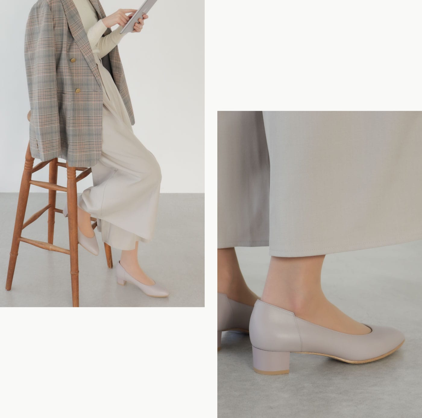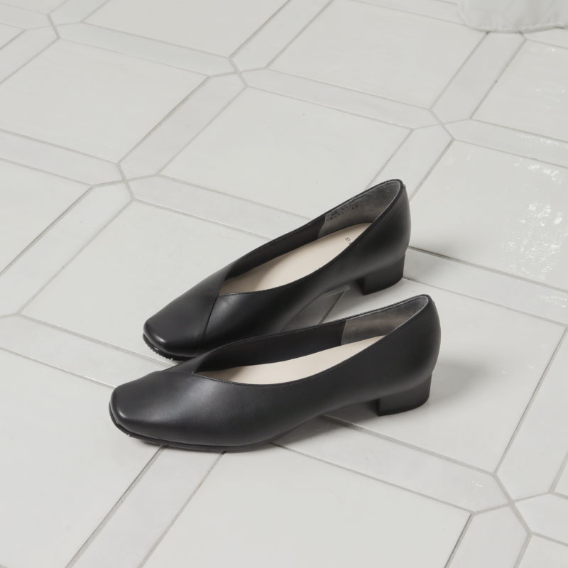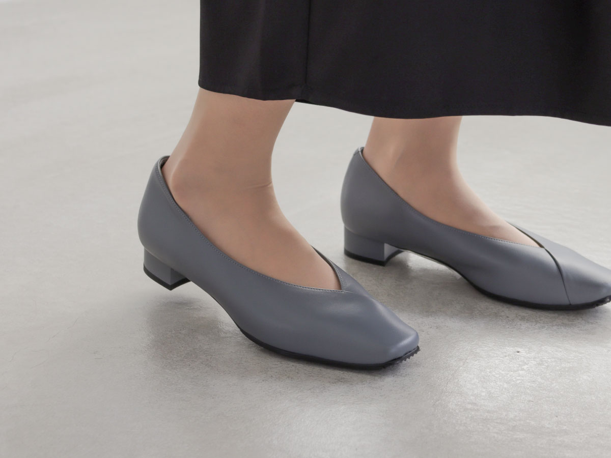 切り替えデザインがアクセントのローヒールパンプスは、スクエアトウで今っぽさと履き心地のよさを両立。つま先の窮屈感を和らげて、長時間でも快適に。