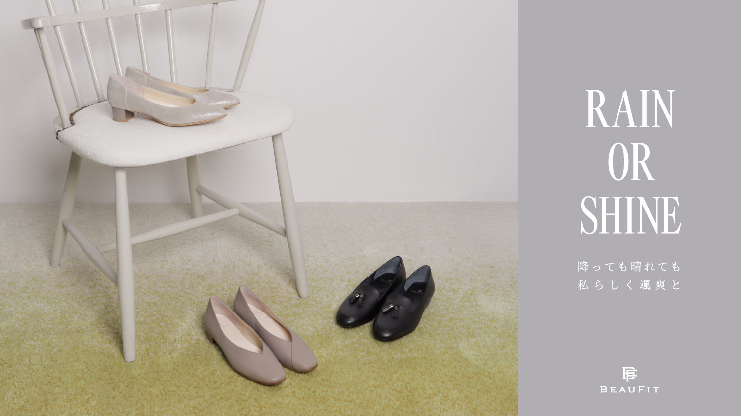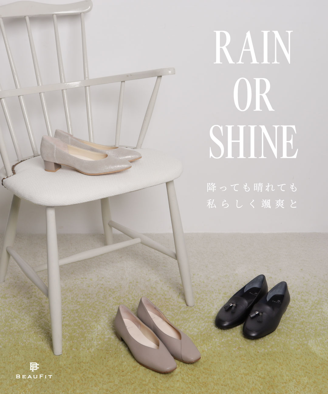 雨の日もおしゃれを諦めず私らしく過ごしたい。BEAUFIT(ビューフィット)はそんな思いに寄り添う、デザイン性と機能性を兼ね備えたオールウェザーシューズを提案しています。撥水レザーとシーリング加工で、雨のストレスを回避。天気に振り回されず、自分らしくいられるアイテムです。