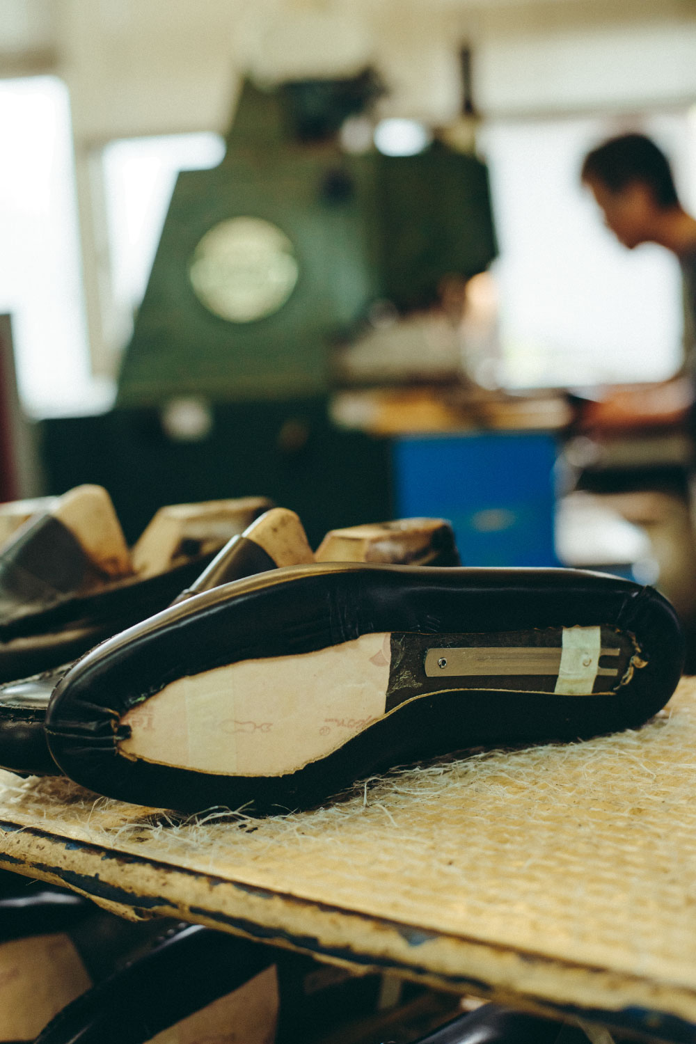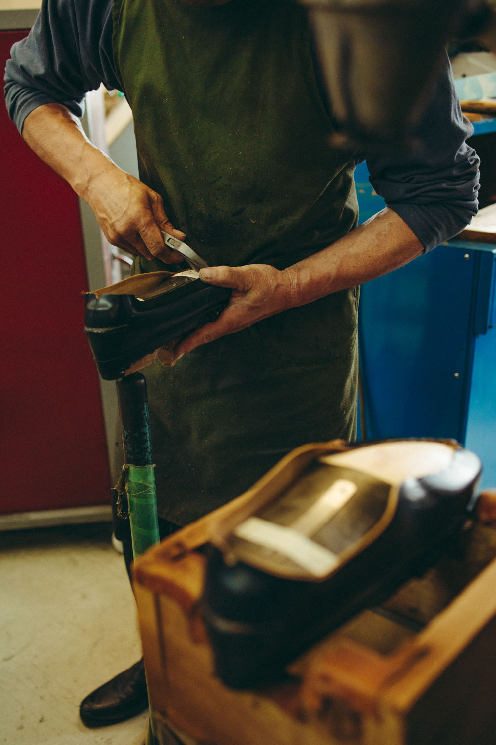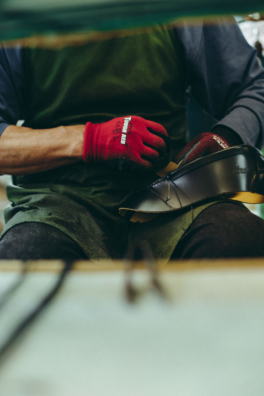 3Eという幅広設計ながら、それを感じさせない程よくシャープにデザインされたシルエットが、トウラスターと呼ばれる機械や手作業を駆使して、木型に丁寧に沿わせることで成形されていきます。