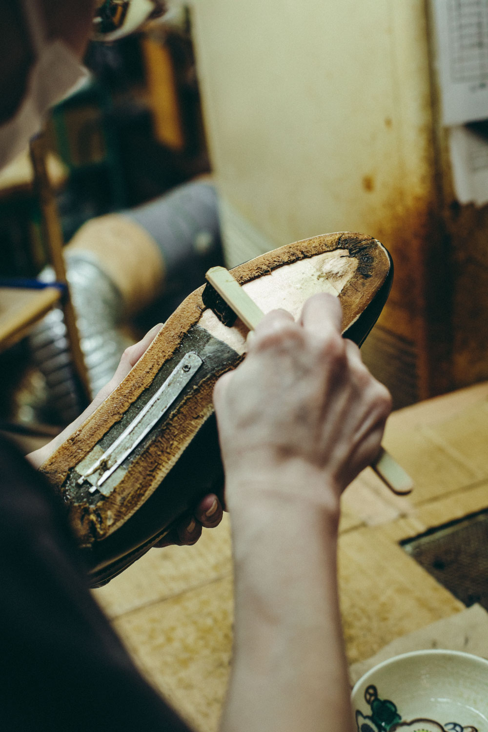 ブランドオリジナルのアウトソールを接着していく工程。生産前に実施される当社基準の剥離試験を合格した商品のみが底付けされているため、強度も充分に備えています。