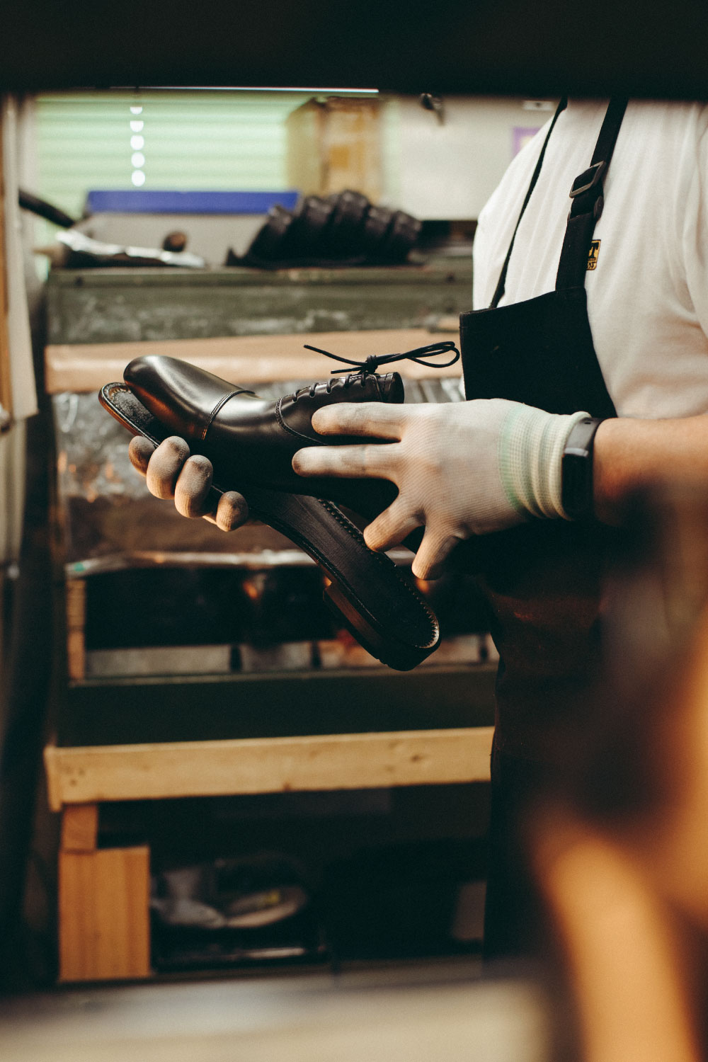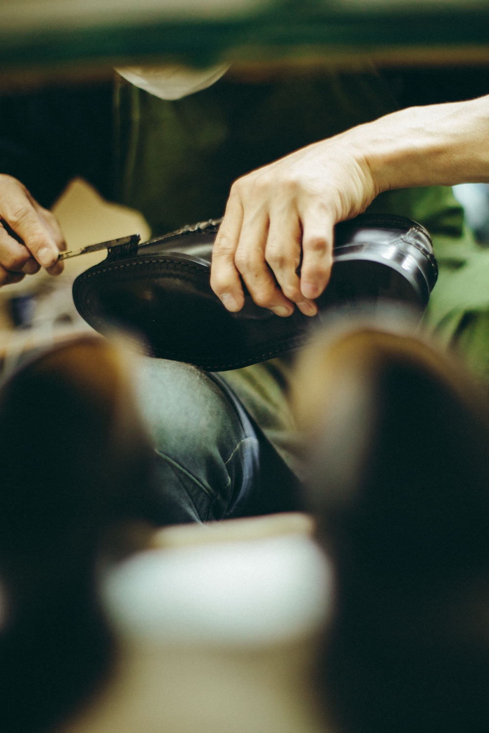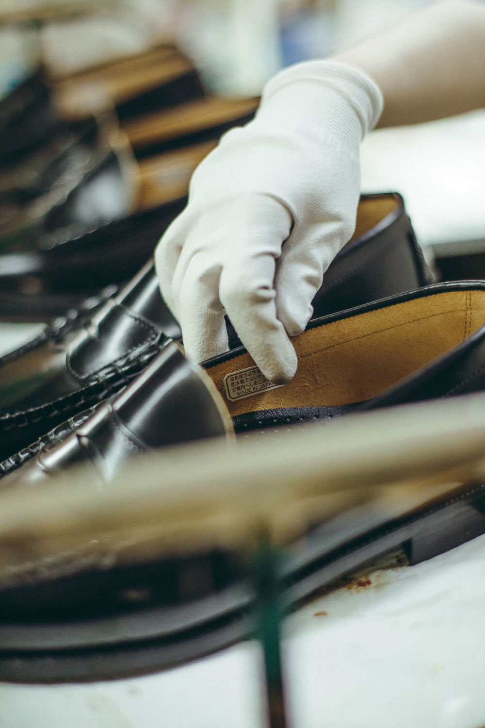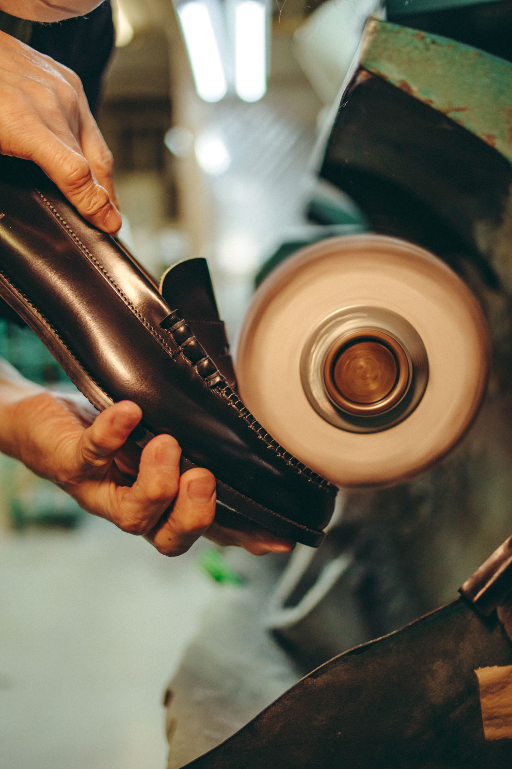 底付けされた靴は、最後に仕上げ工程を経て完成します。製造過程の細かな汚れを落とし、1足1足丁寧に磨き上げていく工程です。完成した製品は最終検品を経て箱に梱包されます。