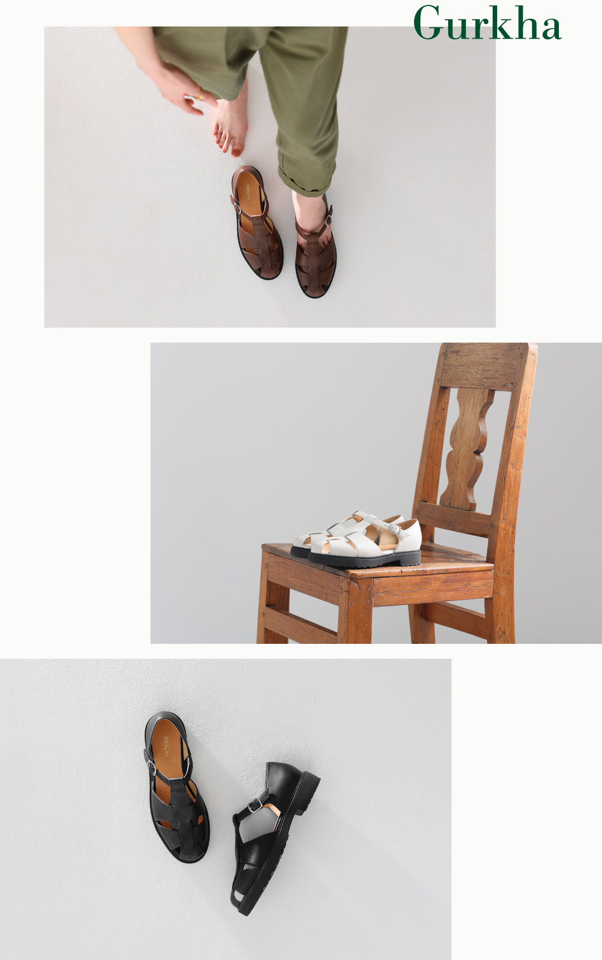軽快な履き心地と抜け感のあるルックスで、サンダルとシューズのいいとこどりなグルカサンダル。今シーズンはトップラインのベルトを細くアレンジし、足首回りをすっきりさせつつ、程よい肌見せでフェミニンなムードもプラスしました。さりげなく覗かせるネイルも夏のスタイリングの楽しみ。