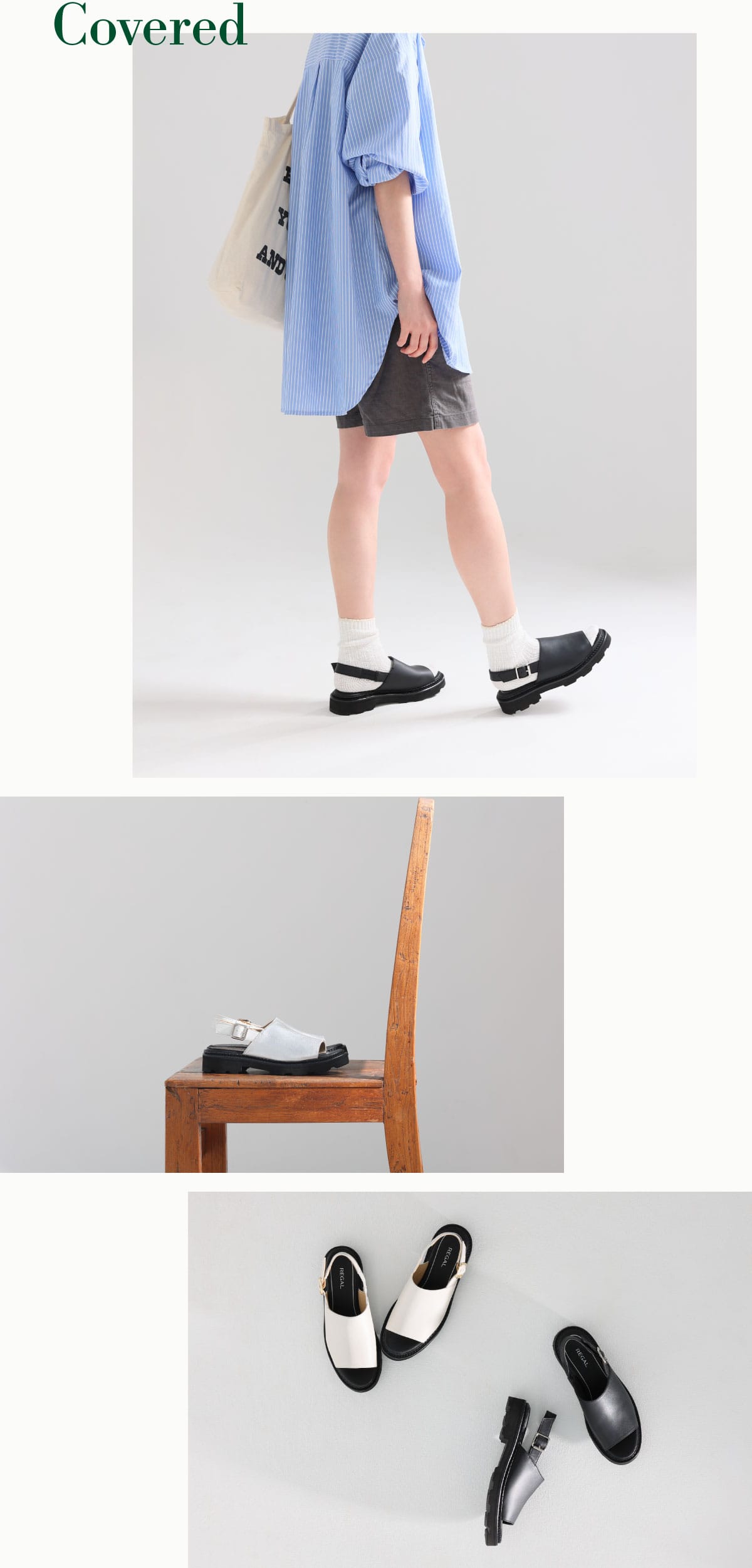 甲を広く覆い包むカバードサンダルは色のチョイスでさまざまなスタイルが楽しめます。クールに締まるブラック、夏らしい華やかなシルバー、カラーネイルと合わせたいアイボリー、コーディネートのアイデアも膨らみます。ミニマルなデザインはボトムスを選ばず、アクティブなショーツスタイルもどこか品よくまとめてくれます。