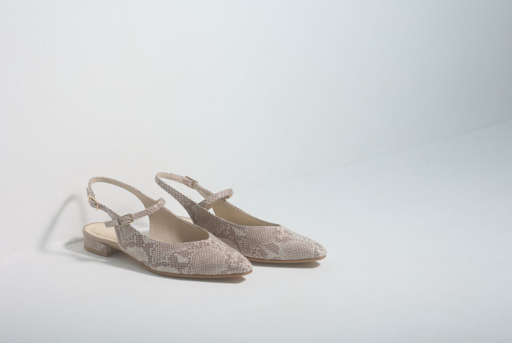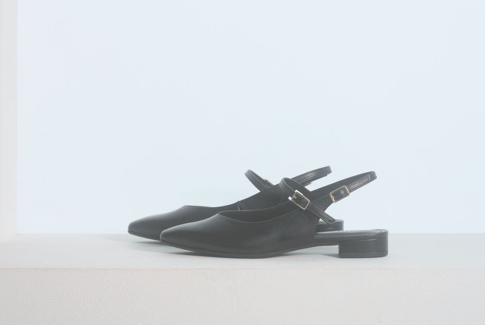 ポインテッドスクエアのトウシェイプとVカットのトップラインが足をきれいに見せつつスタイリングを引き締めます。クールな印象ながら20㎜のフラットヒールでリラクシーな履き心地。