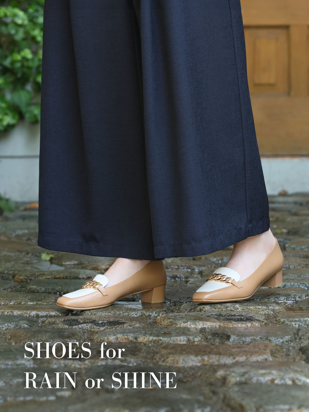 雨の日でも、きちんと感を崩したくない人に。 おすすめは、フラットのベルテッドパンプスと、35㎜ヒールのチェーンビットパンプス。 デイリーはもちろん、フォーマルなシーンにも対応するデザインだから、急な天気に左右されず、“今日はこれを履きたい”をあきらめなくていいのも魅力です。
