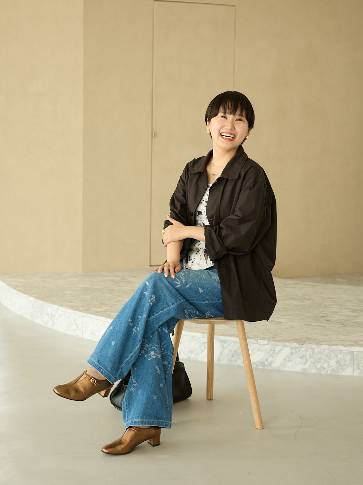 シャープなカッティングデザインのフラットシューズ。革が柔らかく足に馴染みやすいのが魅力で、キラッとしたゴールドも気に入っています。靴を主役に、季節の変わり目を意識して脱ぎ着しやすいジャケットを取り入れました。