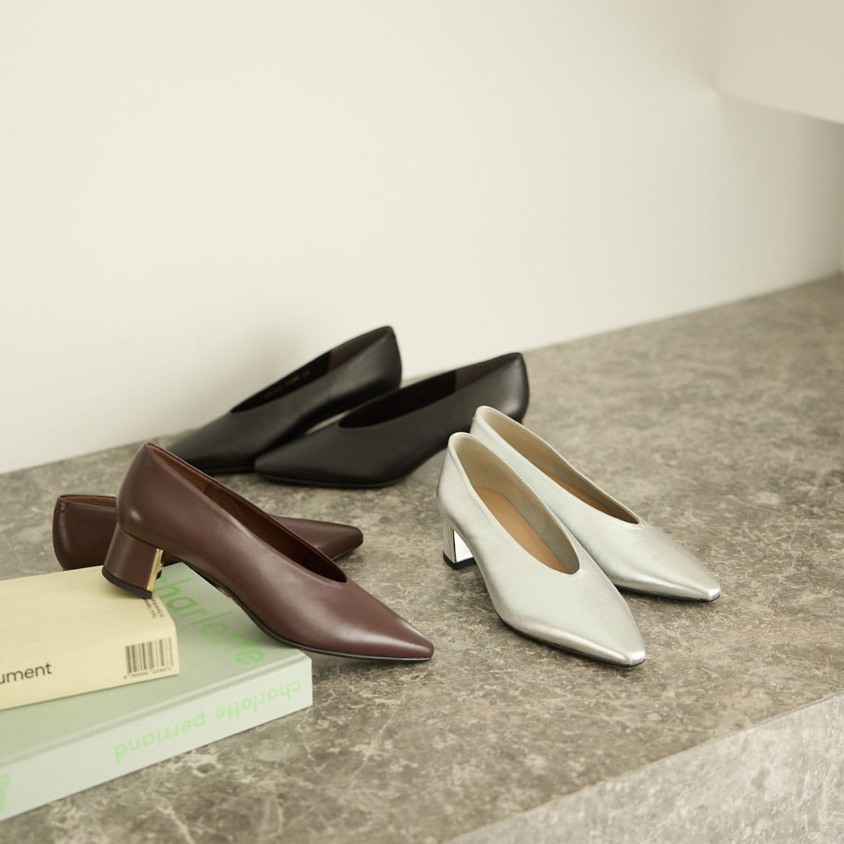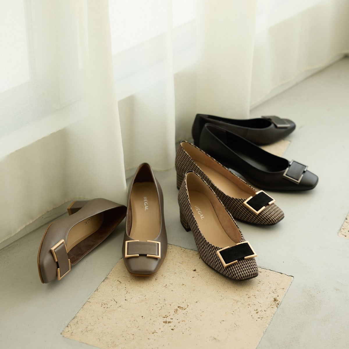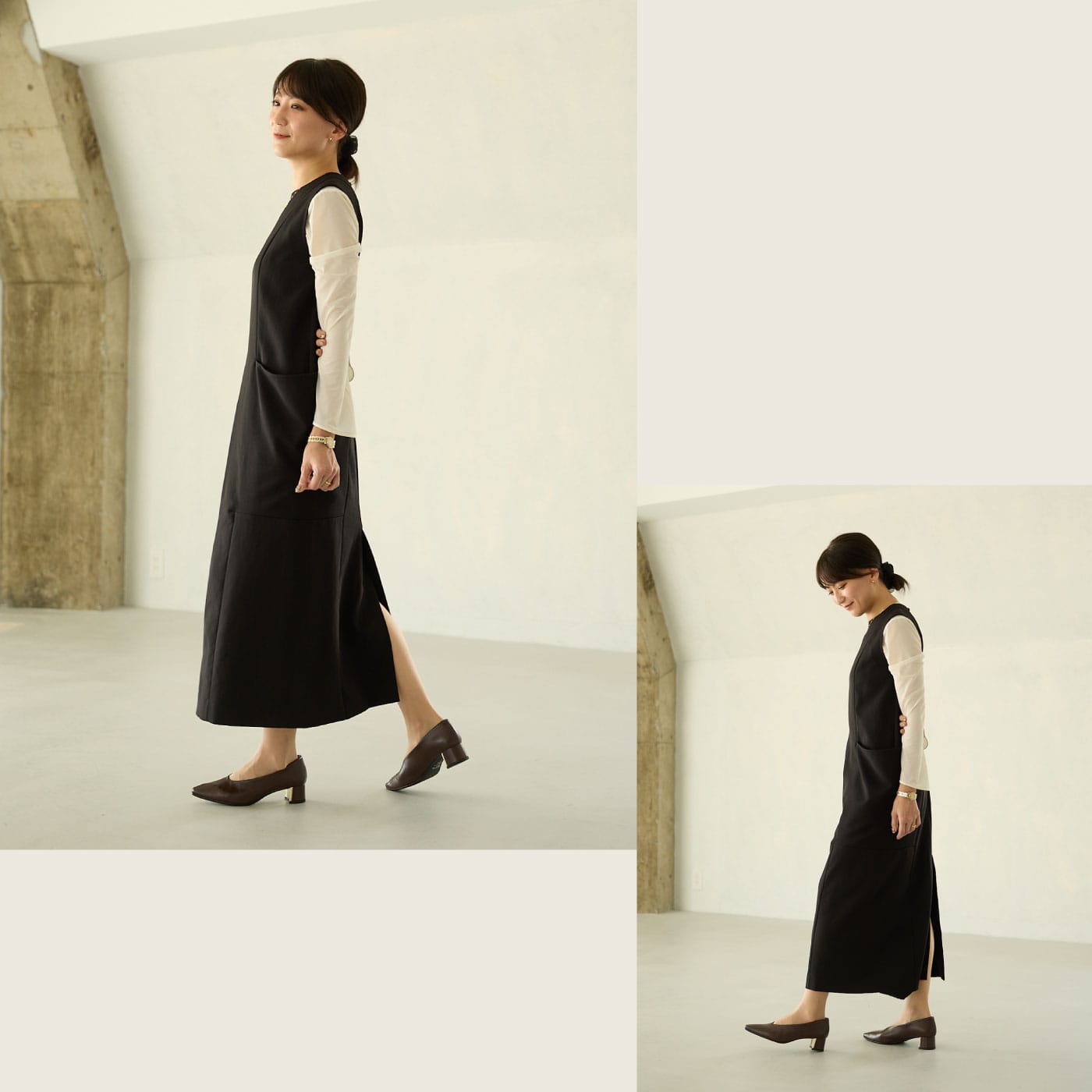 モノトーンにゴールドを合わせるのが好きです。そのスタイルに合わせて選んだパンプスは、ヒールの内側にあしらわれたさりげないゴールドがポイント。見た感じより革が柔らかく、ブロックヒールも高さを感じない安定感があって楽に履けます。