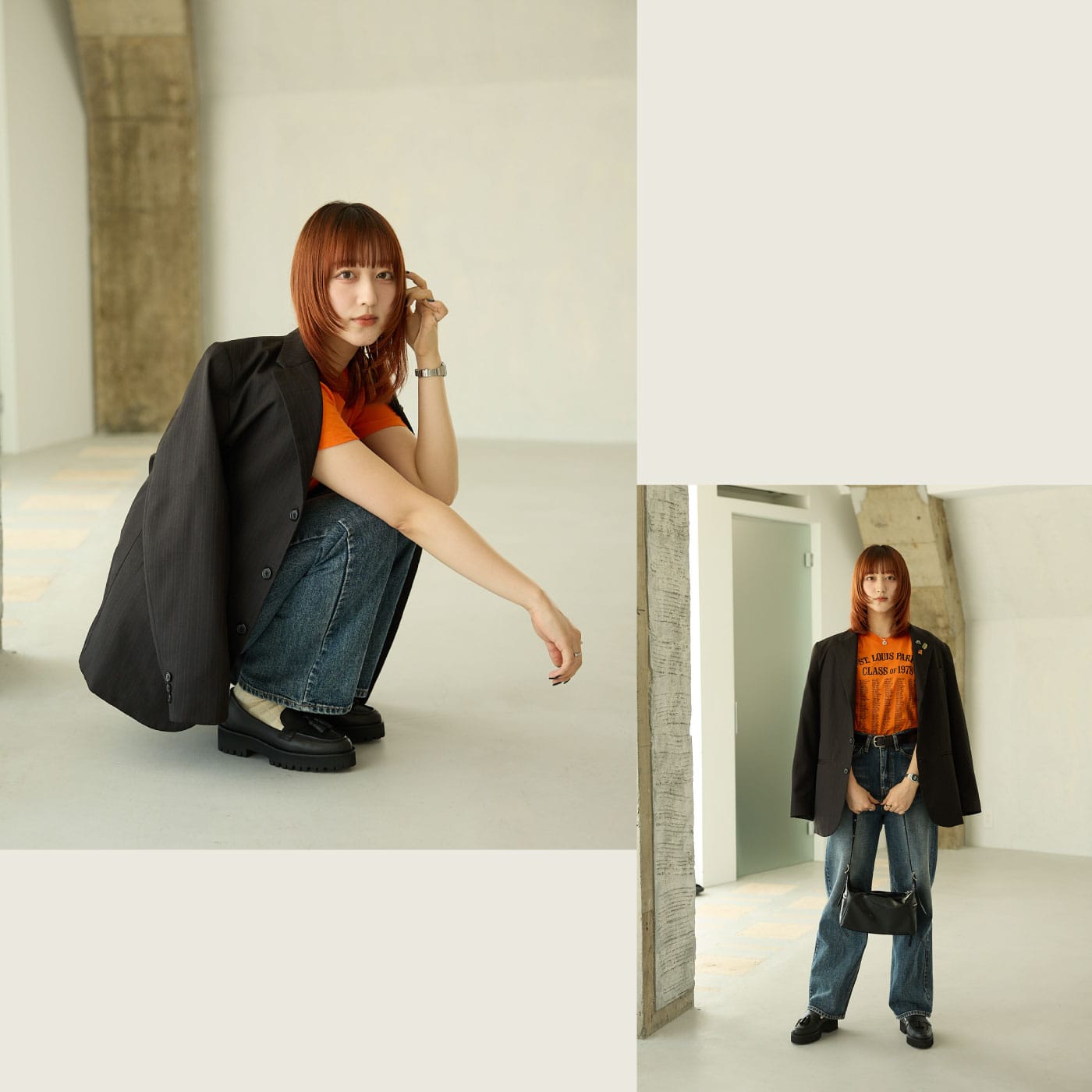 トレンドのローファー + ボリューム感のあるデザインが今の気分。厚めのソールのクッションが効いていて履き心地がとてもいいです。カジュアルなオレンジのTシャツとデニムに、ローファーのトラッドさを引き出すジャケットを合わせました。