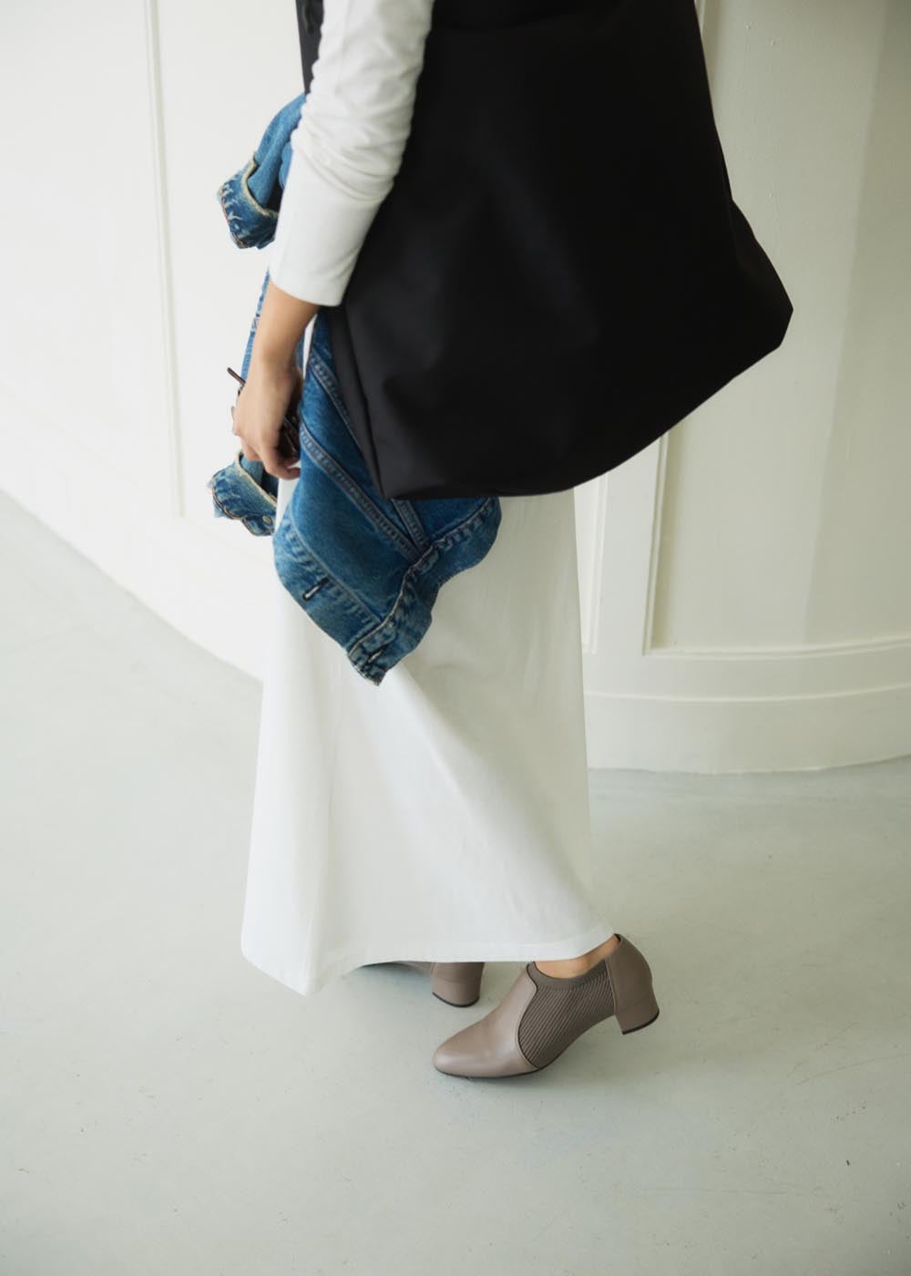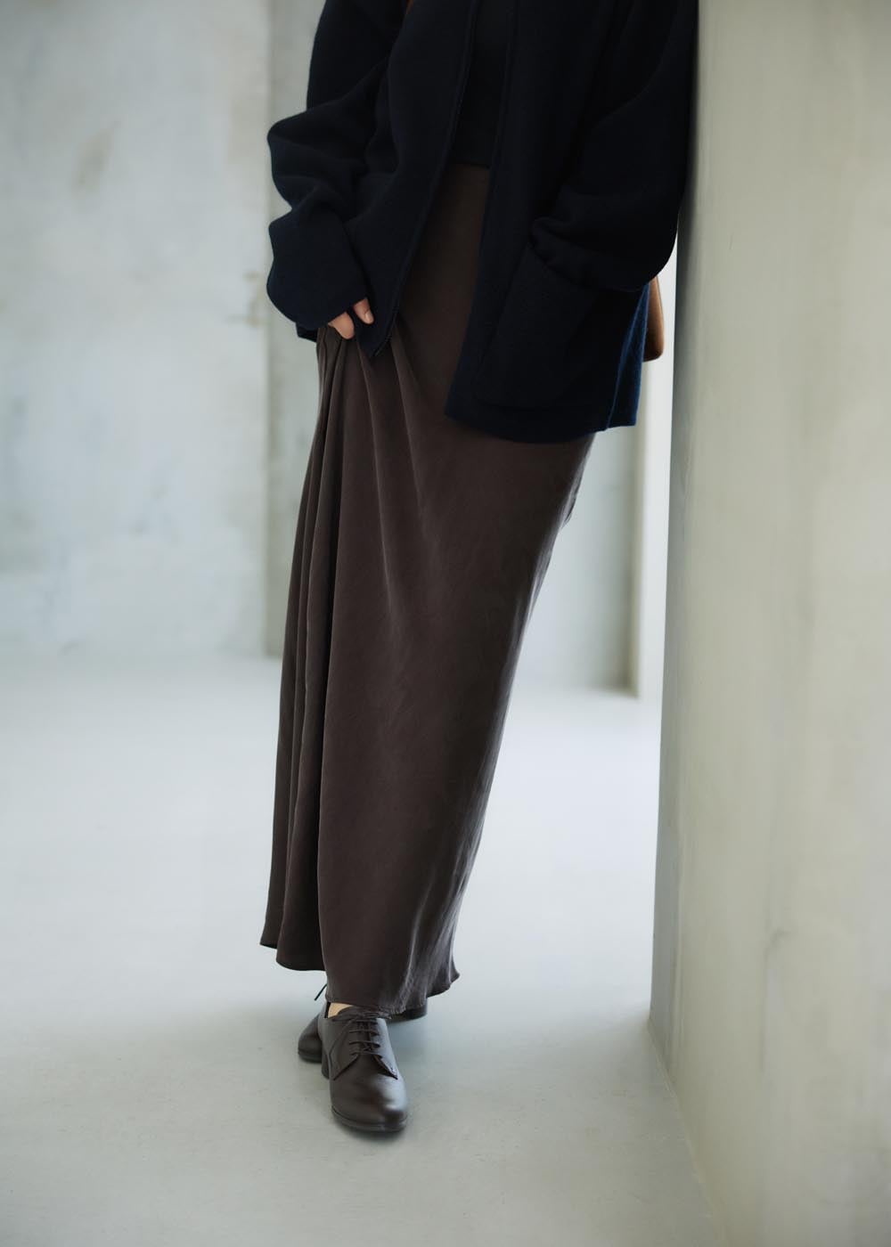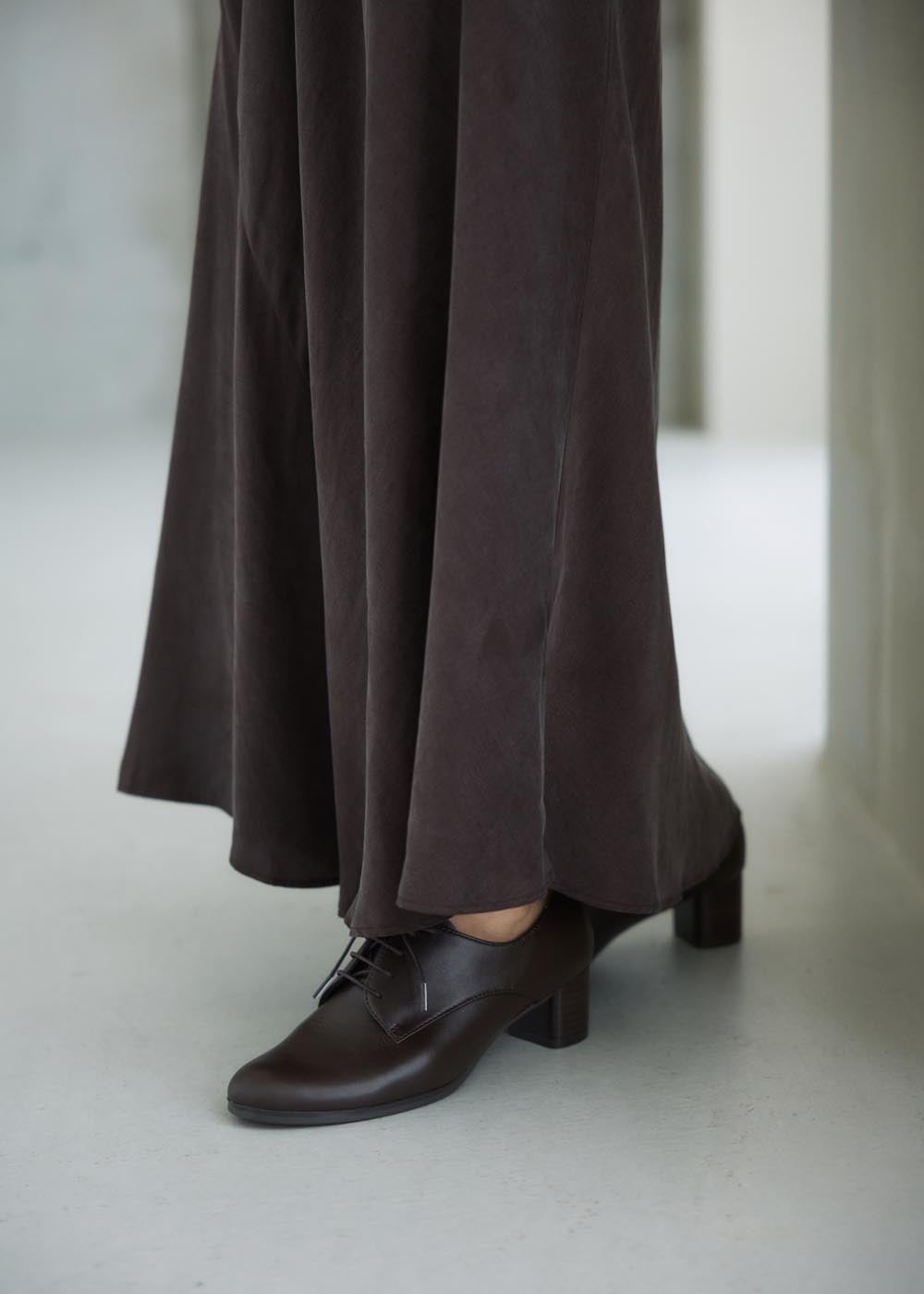 スカートのダークブラウンとの色繋ぎを意識しました。スカートのシルエットや揺れ感を同色のシューズが引き立たせてくれています。ブラウン×ネイビー×グレーといった定番カラーの合わせですが、それぞれの素材感も活かしながら組んだスタイリングです。