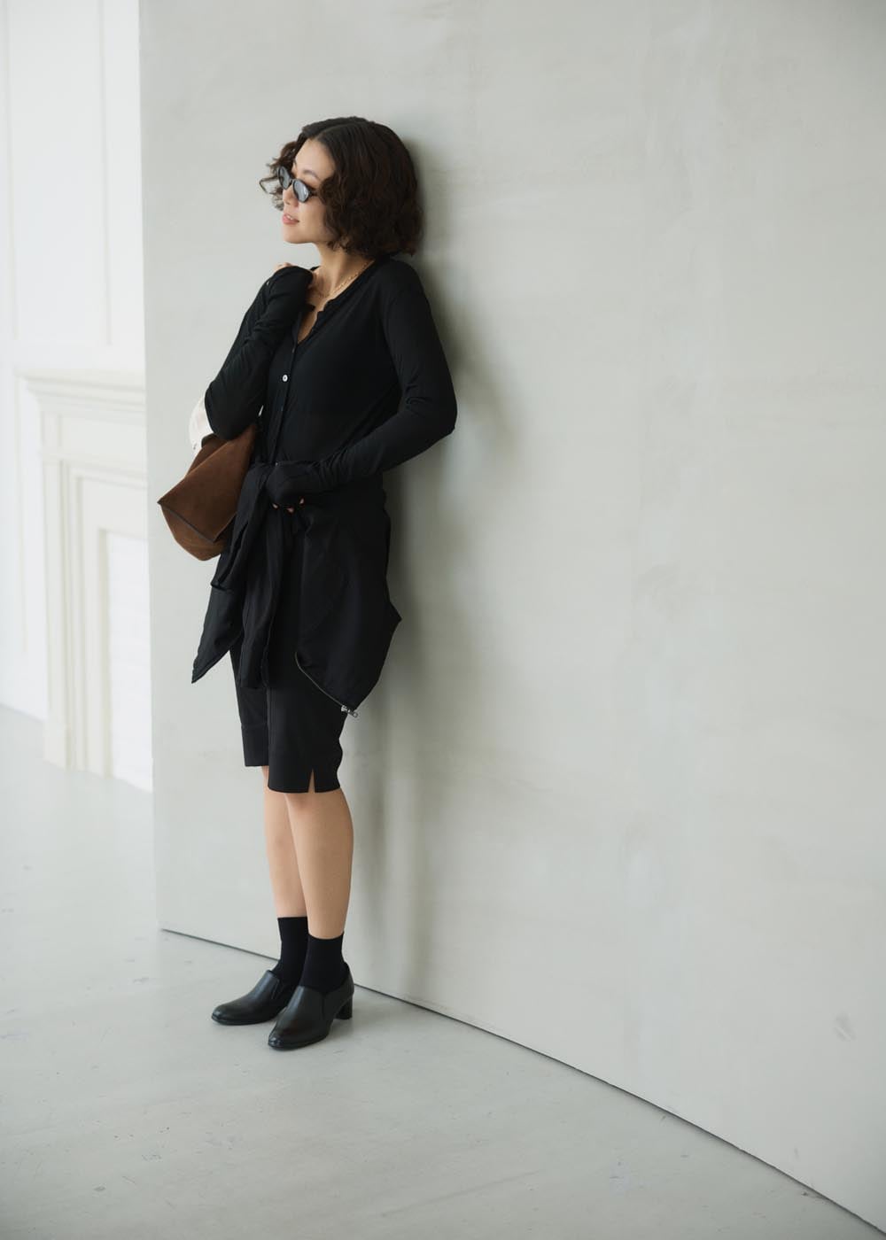 黒のソックスで靴との色をつなげることで、ブーツのようなシルエットに仕上げました。ブーツほど重くならず、パンプスやサンダルよりも季節感を取り入れられる、おすすめの合わせ方です。気温が安定しないこの時季は、さっと羽織れるアイテムを腰に巻いておくことで、利便性とおしゃれ感の両立を意識しています。
