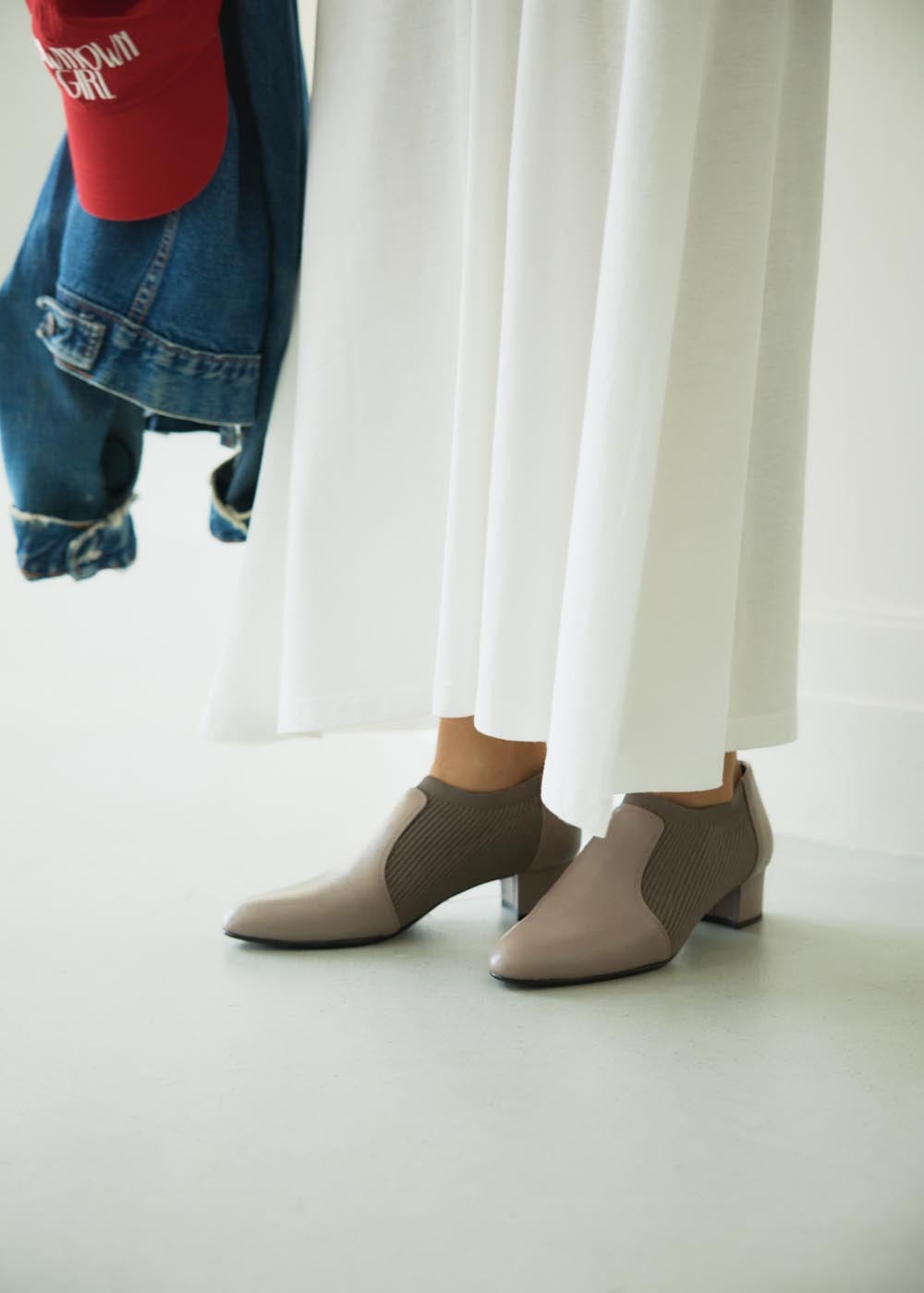 ニット素材の柔らかな印象を、丸みを帯びたアーモンドトウが引き立てる優しい雰囲気のシューティ。デザイン性に加え、ニットならではの伸縮性でさっと脱ぎ履きできるのも嬉しいポイントです。
