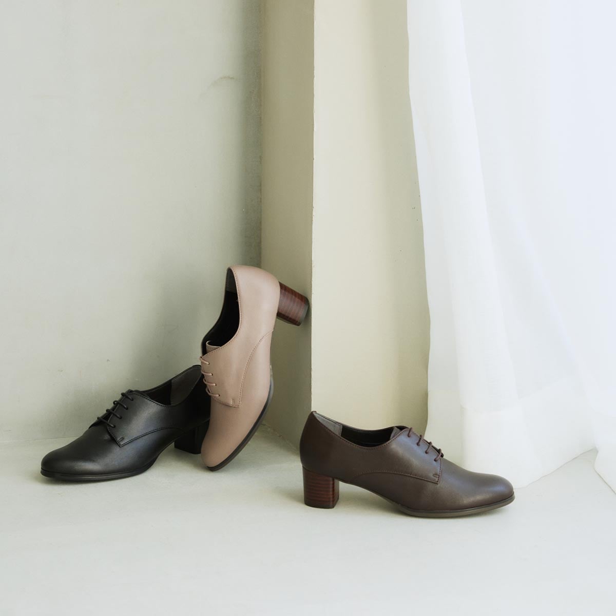 マニッシュな印象のレースアップシューズも、ヒールアップすることでぐっとエレガントに。パンツにもスカートにも相性のよい、一足は持っていたい実力派のアイテムです。
