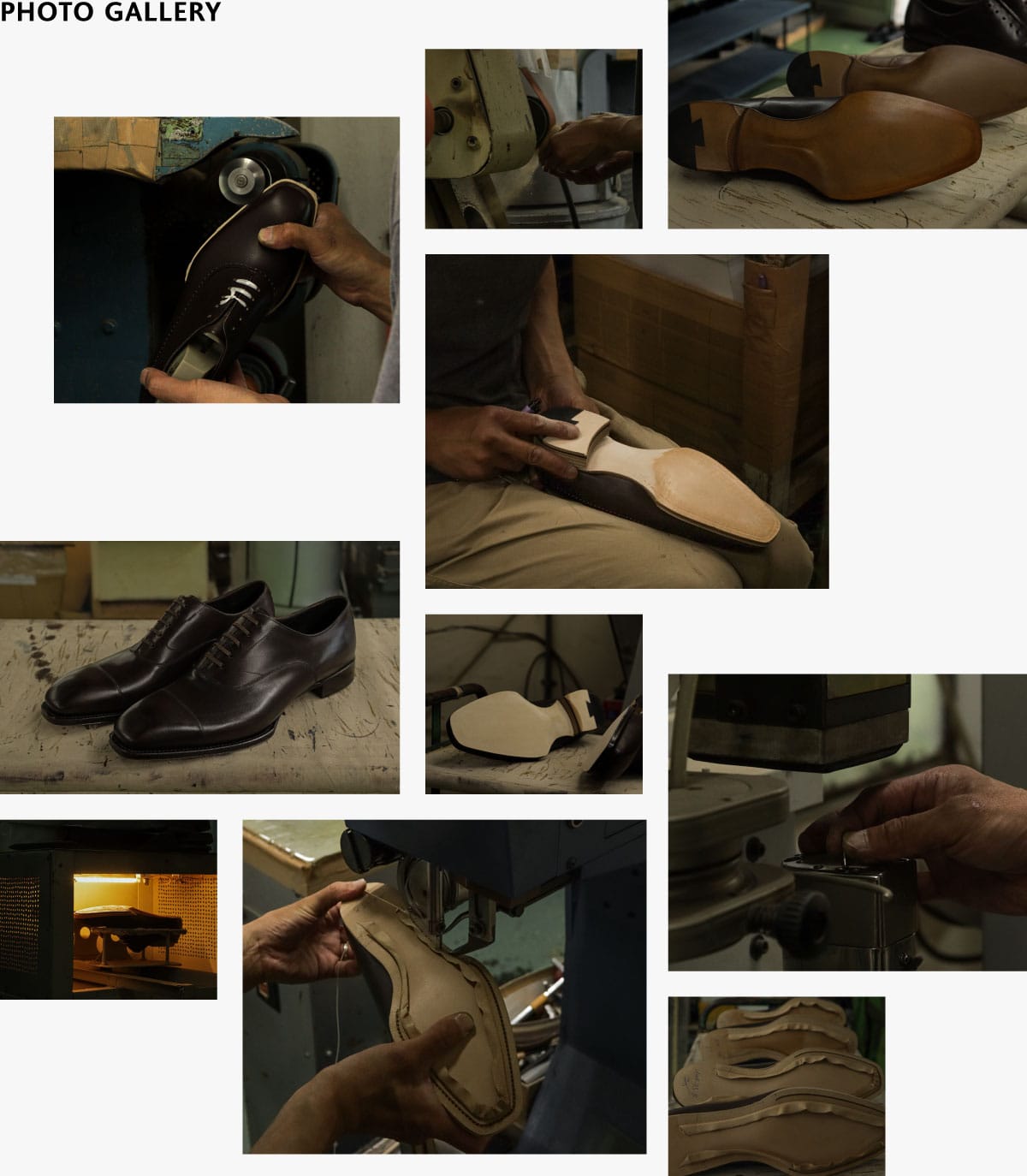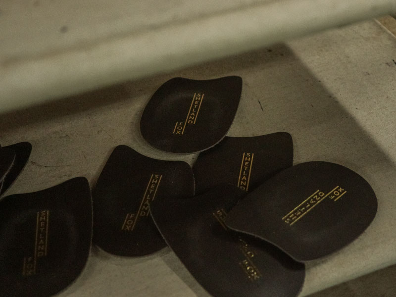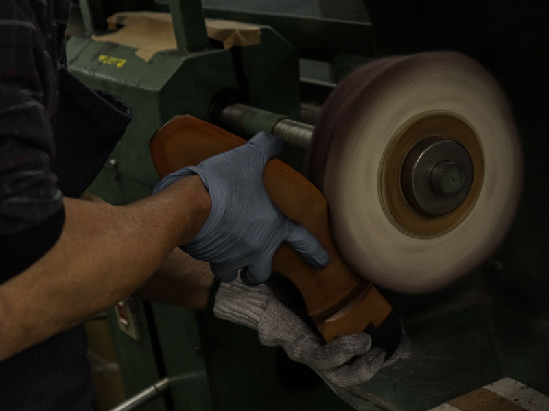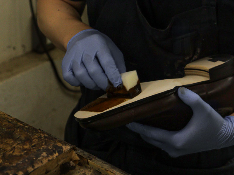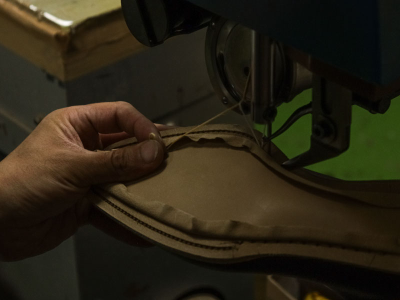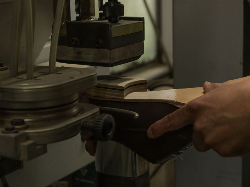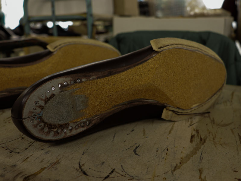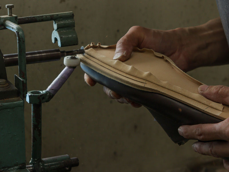 拘りが詰め込まれた職人の手仕事でソールが仕立てられる。 踏まず中心部分を山のようにそり立たせたフィドルバック。その美しいラインを生み出すために、職人が手で叩きながら1足ずつ形を整えていく。