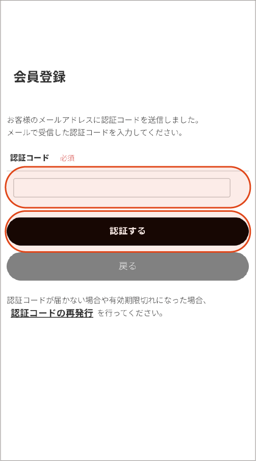 4入力したメールアドレスに届いた認証コードを入力し認証するをタップ