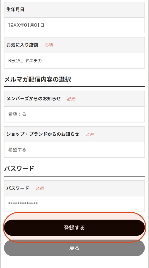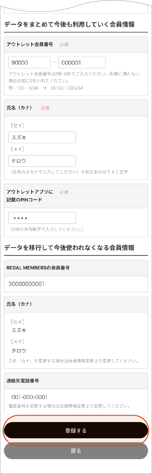 4アウトレットの会員情報と1のPINコードを入力、リーガルメンバーズの情報を確認後、登録するをタップ