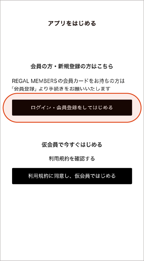 1アプリを開きログイン・会員登録をしてはじめるをタップ