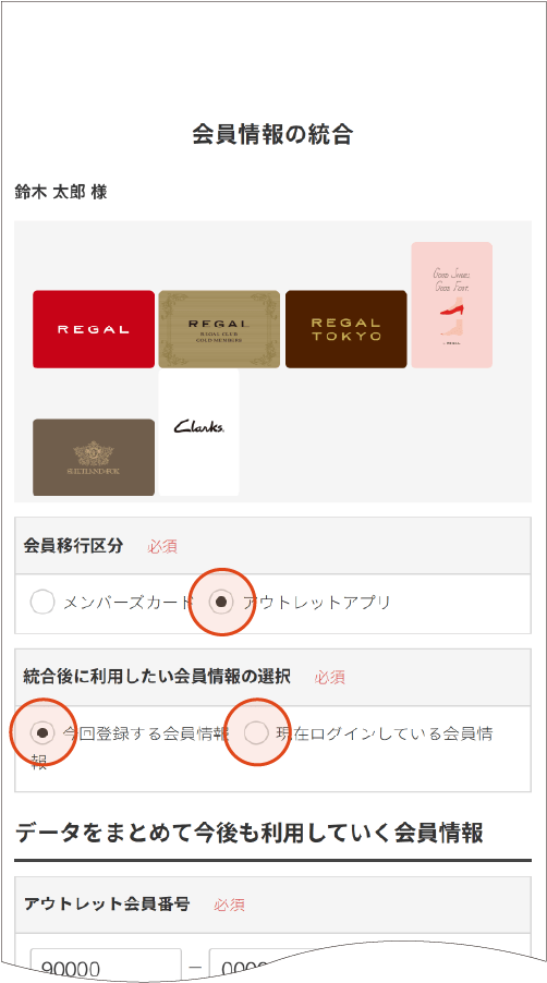3会員移行区分のアウトレットアプリと統合後に利用したい会員情報の選択のうちのいずれかにチェック