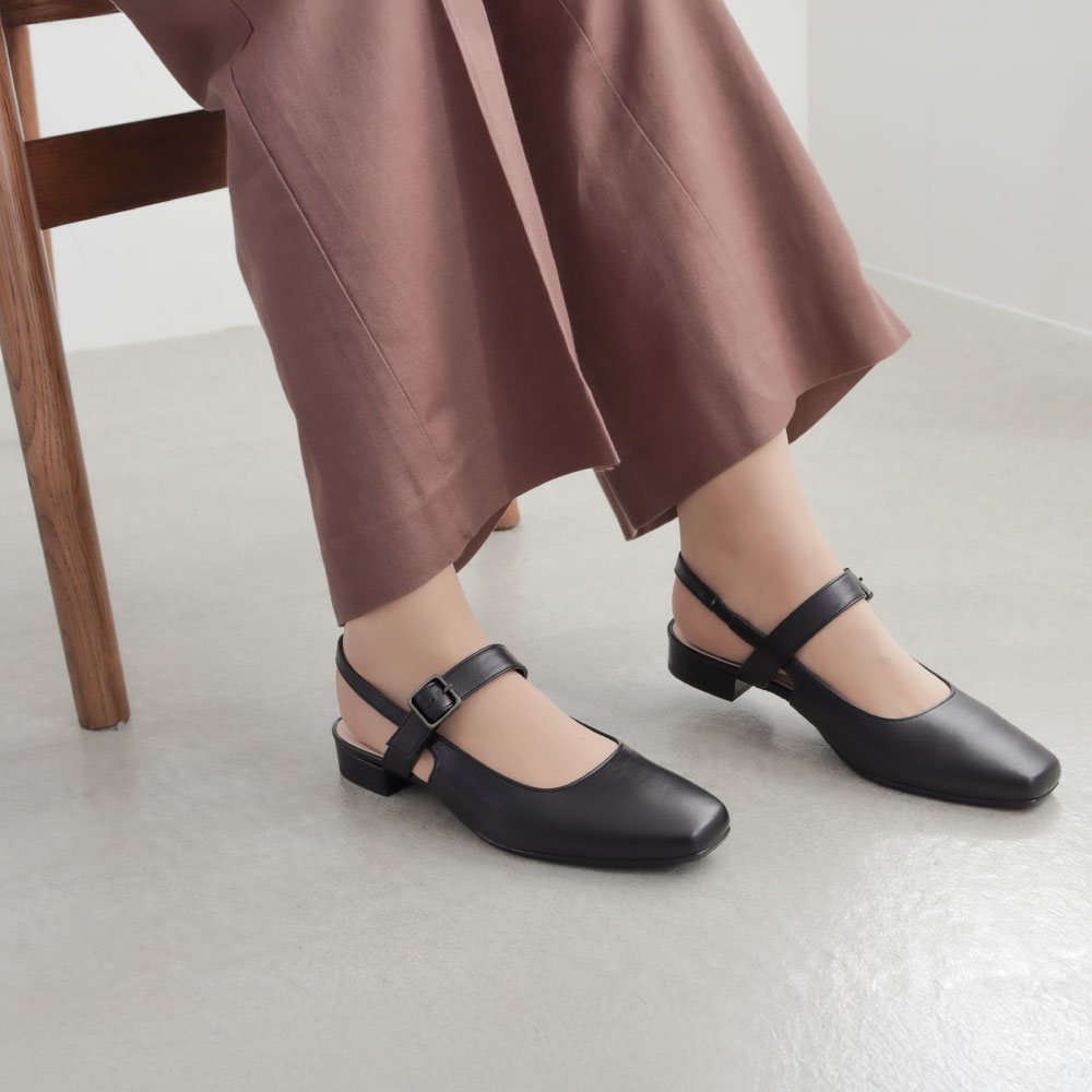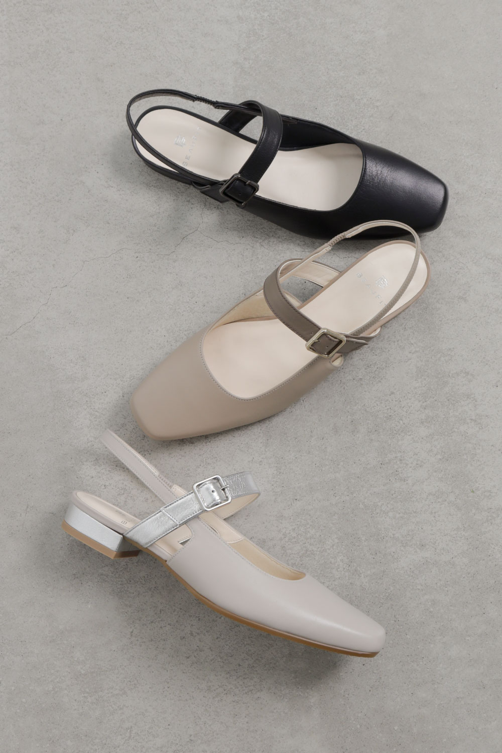 バックベルトのデザインに惹かれて買ったパンプス、パカパカしないように締めると喰い込みが気になることも。バックベルトに、メリージェーンの要素を加えたこのパンプスなら、ストラップがずれて安定感がなくなるこの問題に応えられます。