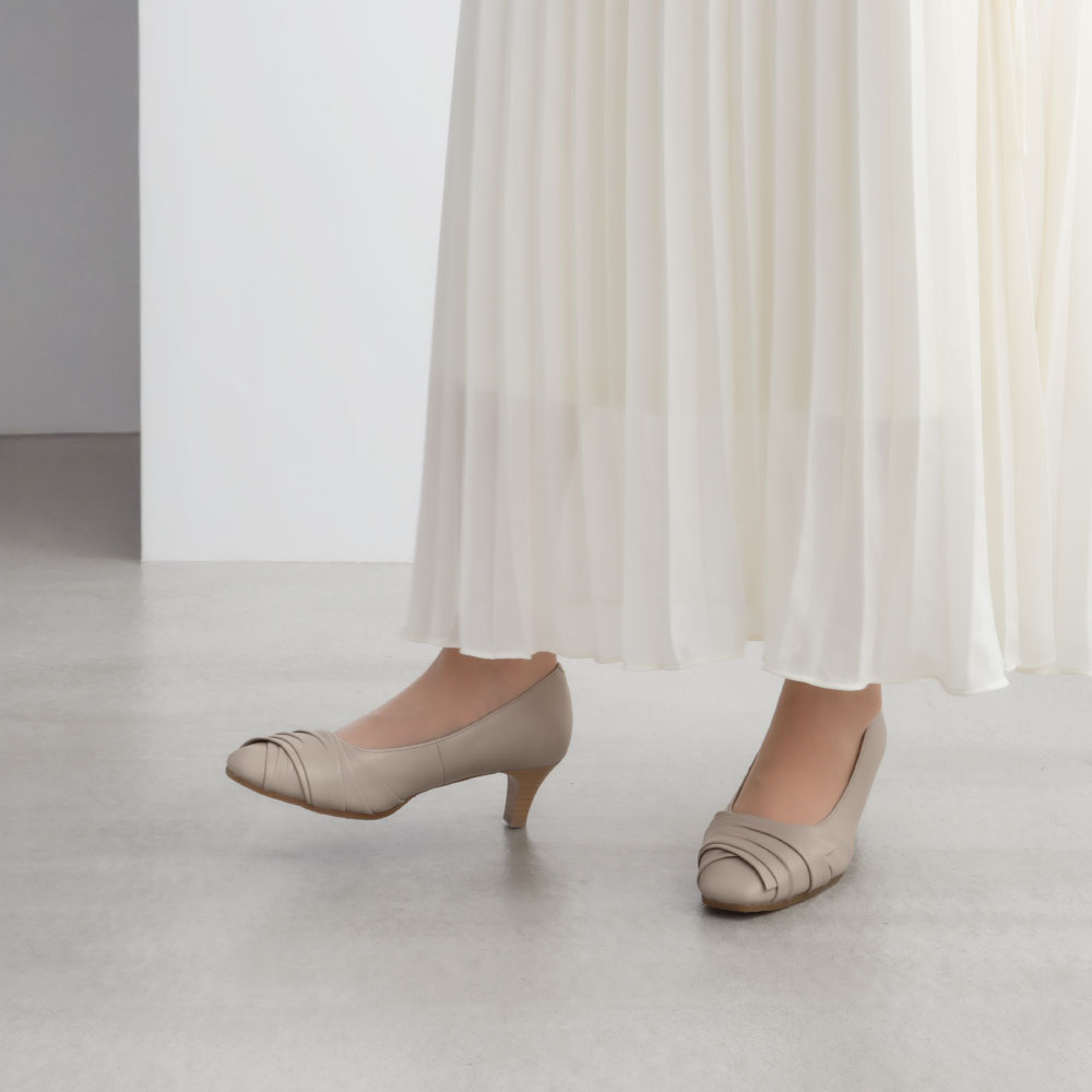 窮屈感をあまり感じずラクな履き心地のパンプスは、気にいるデザインを見つけるのが難しいこともあるのでは。 足指を締め付けないソフトなスクエアトウに繊細なドレープをのせたデザインは、ゆったりしながら華やかさを叶えます。