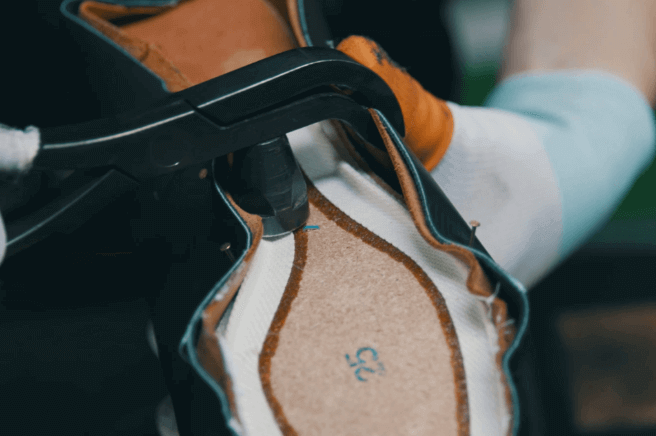 木型のシルエットを細部まで再現するキーポイントとなる工程の一つが、“横釣り” 。ワニと呼ばれる専用の工具で甲革を引っ張り、木型に沿わせます。革の伸び具合などを考慮しながら、一足一足加減する必要があり、そこには職人の研ぎ澄まされた感覚が求められます。The MASTER REGALの端正で美しいシルエットは、この様な技によって生み出されています。