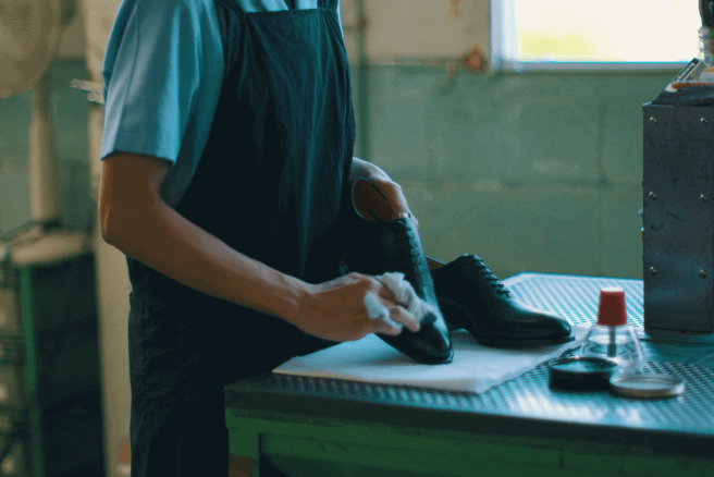 ワックスでハンドポリッシュをするのも他のモデルではあまり施されない特別な工程。ワックスと水分を絶妙なバランスで混ぜ合わせて、時間をかけて塗り込む手間暇も大きなこだわり。それにより、トウ部分には艶やかで品のある表情が宿ります。
