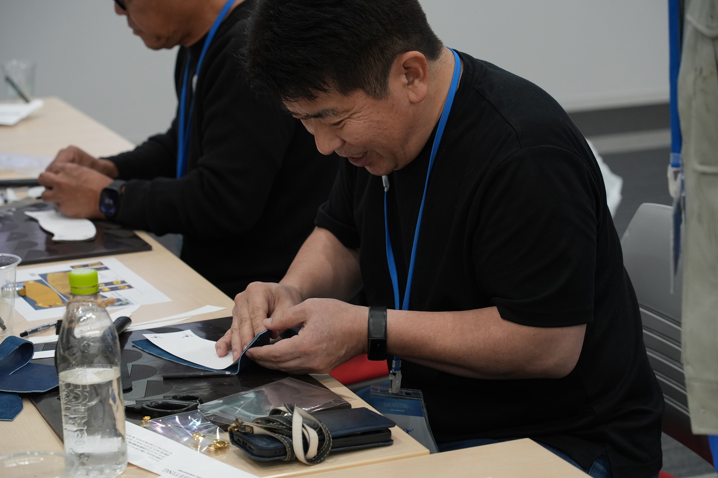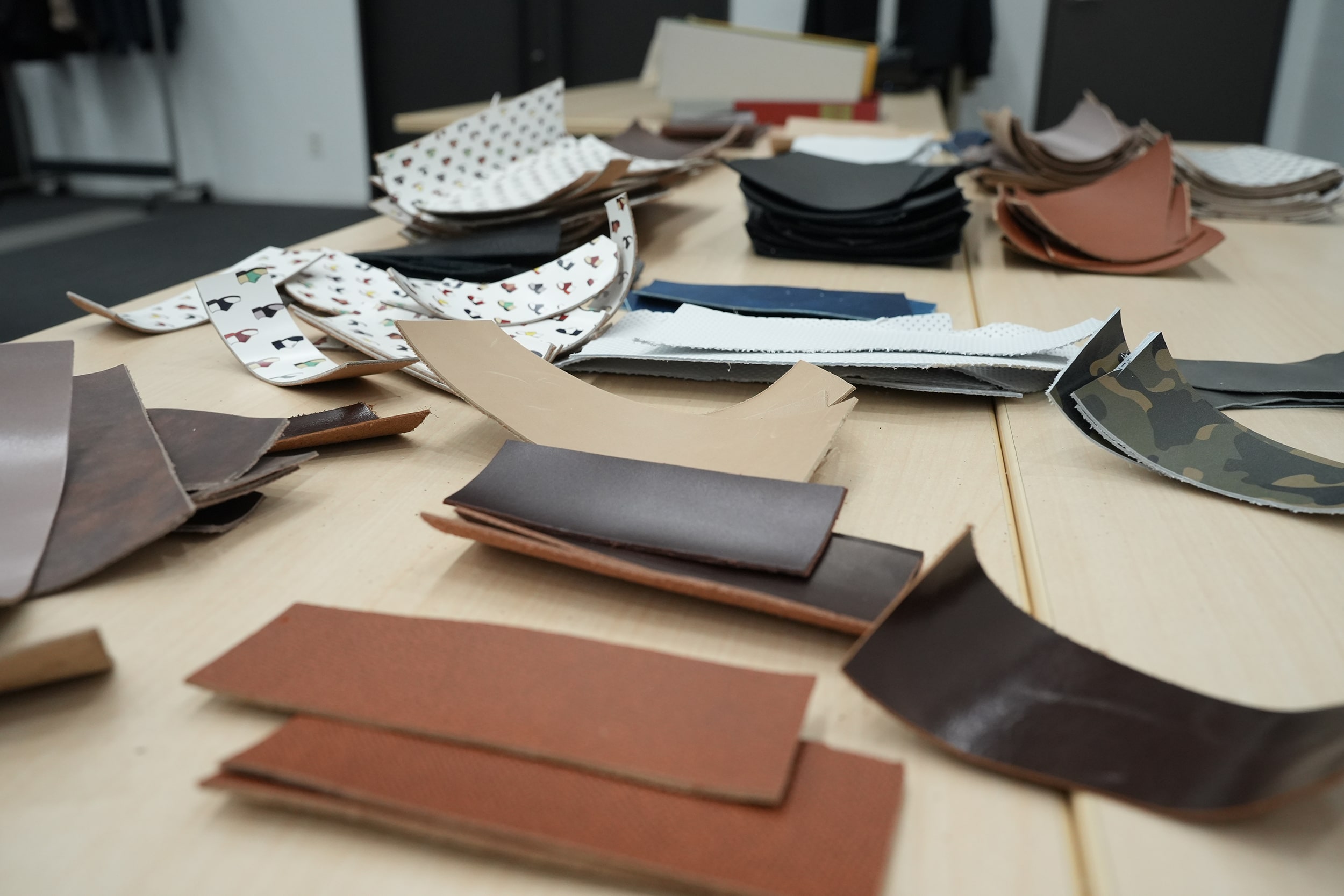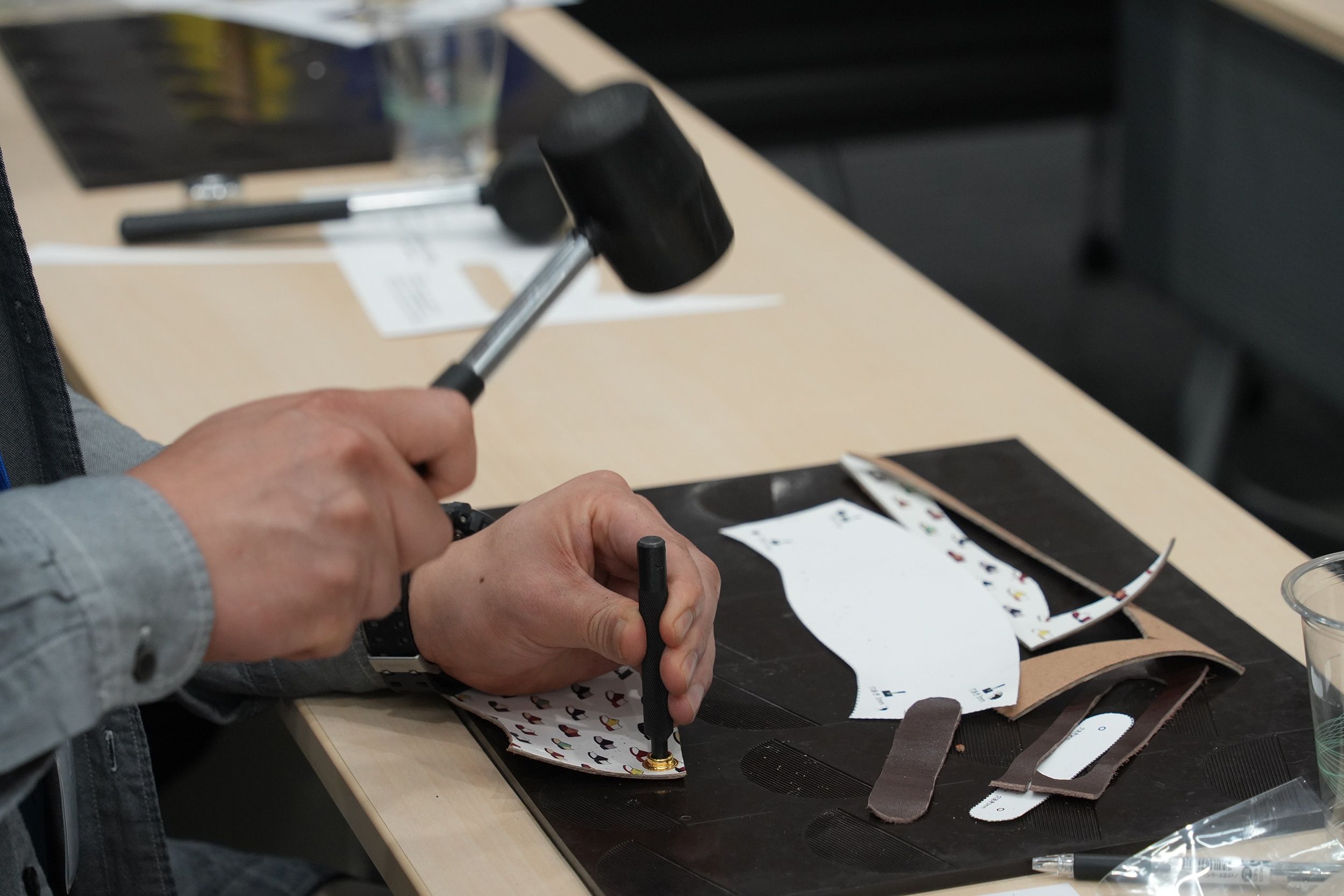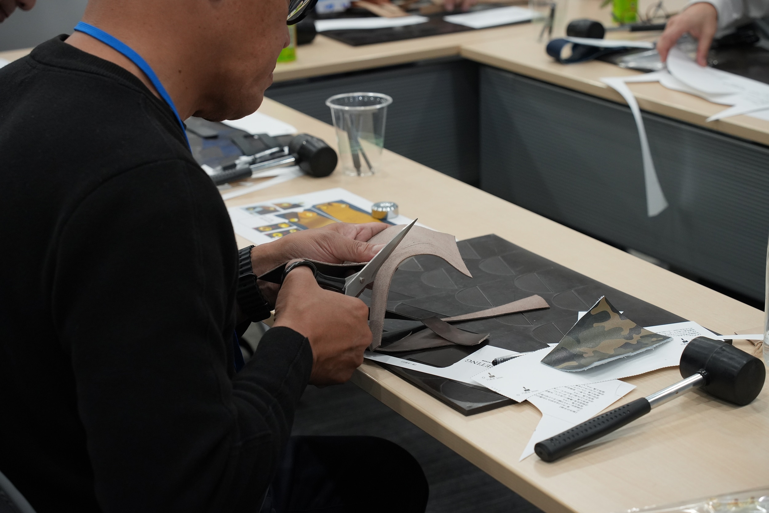 当社の靴づくりにおいて重要な革に触れていただくため、お好きな色の革や金具を選びカップホルダーを作成いただきました。