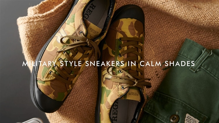 落ち着いたカラーリングのカモフラ柄を纏ったミリタリーテイストのスニーカー-