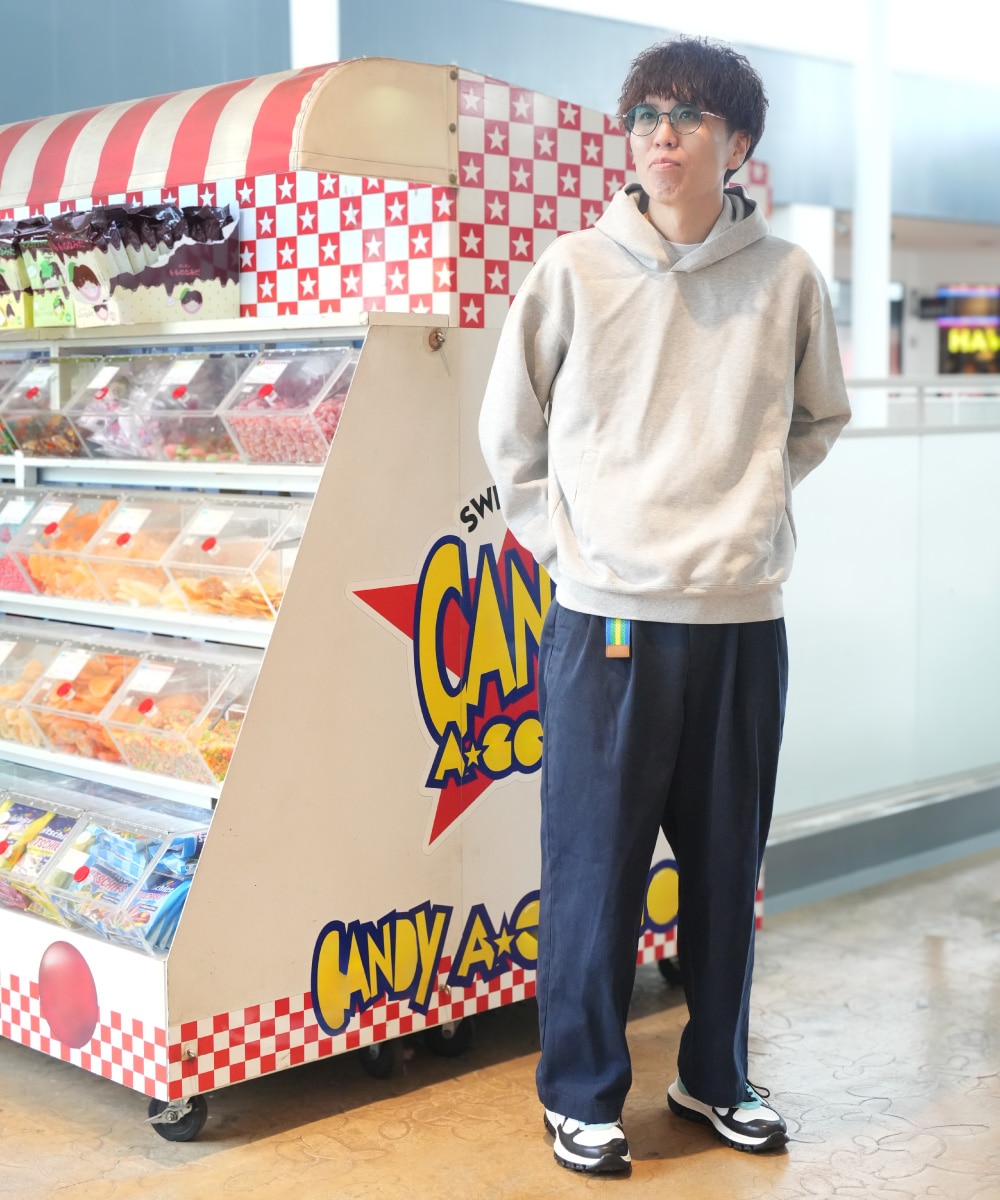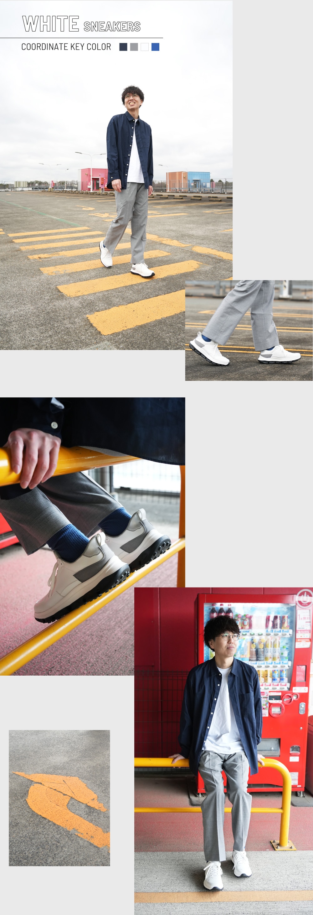 上質な白パーカーに、ネイビーのチノパンツ。そこにこの一足を合わせるだけで、大人の遊び心を演出します。