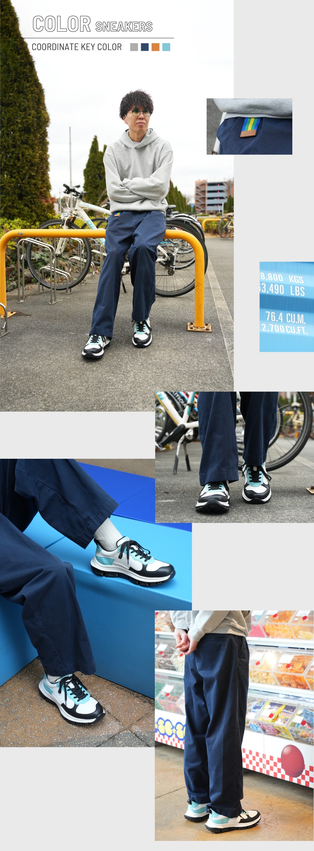 アクセントカラーのスニーカーを軸に、色数を絞ったスタイリング。