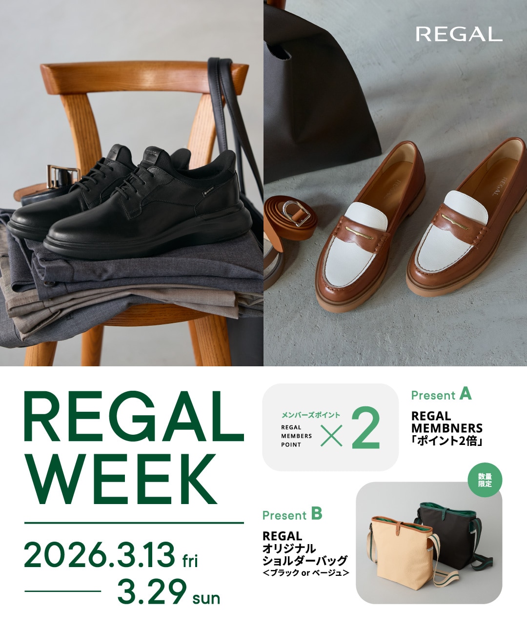 ※ REGAL ONLINE SHOP でのお買い上げは、オリジナルショルダーはお選びいただけません。「ポイント 2 倍」のプレゼントのみになります。