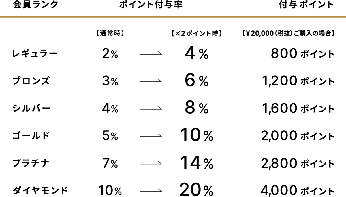 ※セール商品・修理・有料サービスは会員ランクに関わらず、ご購入金額(税抜)200 円につき 1 ポイントの 2 倍(2ポイント)となります。
