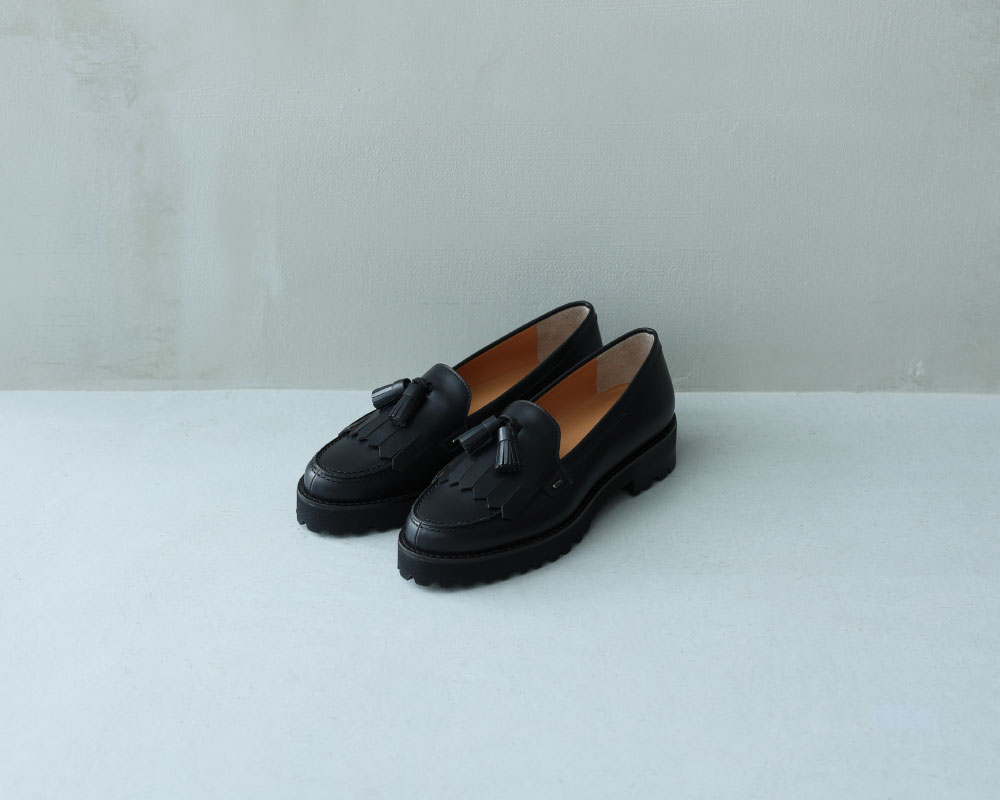 キルトと呼ばれるフリンジの飾りがクラシックな表情を添える「キルトタッセルローファー」。ボリュームソールと組み合わせることで今の空気をまとい、新たな表情を見せます。