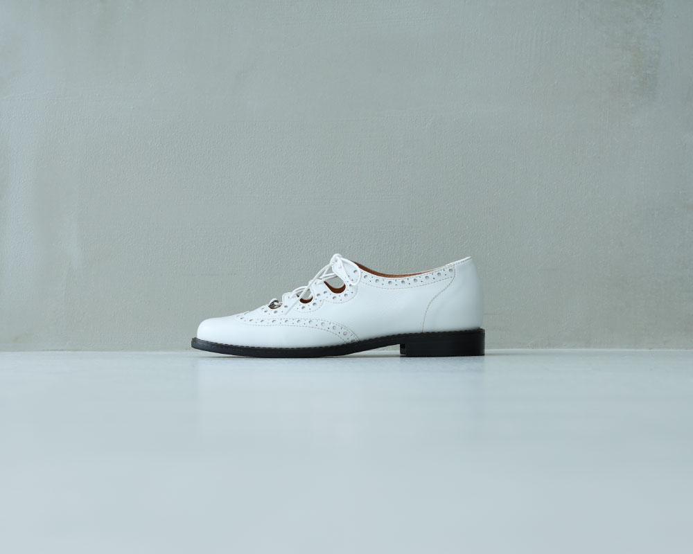 甲のレースアップが生み出すリズミカルな抜け感が足元に軽やかさを与えてくれます。柔らかなラウンドトウやカッティングで、凛とした雰囲気の中に女性らしさを表現しました。ソックスの色や素材次第で、トラッドにもモードにも表情を変えるスタイリングの楽しさも魅力。