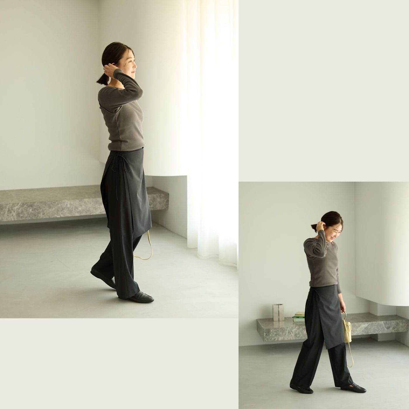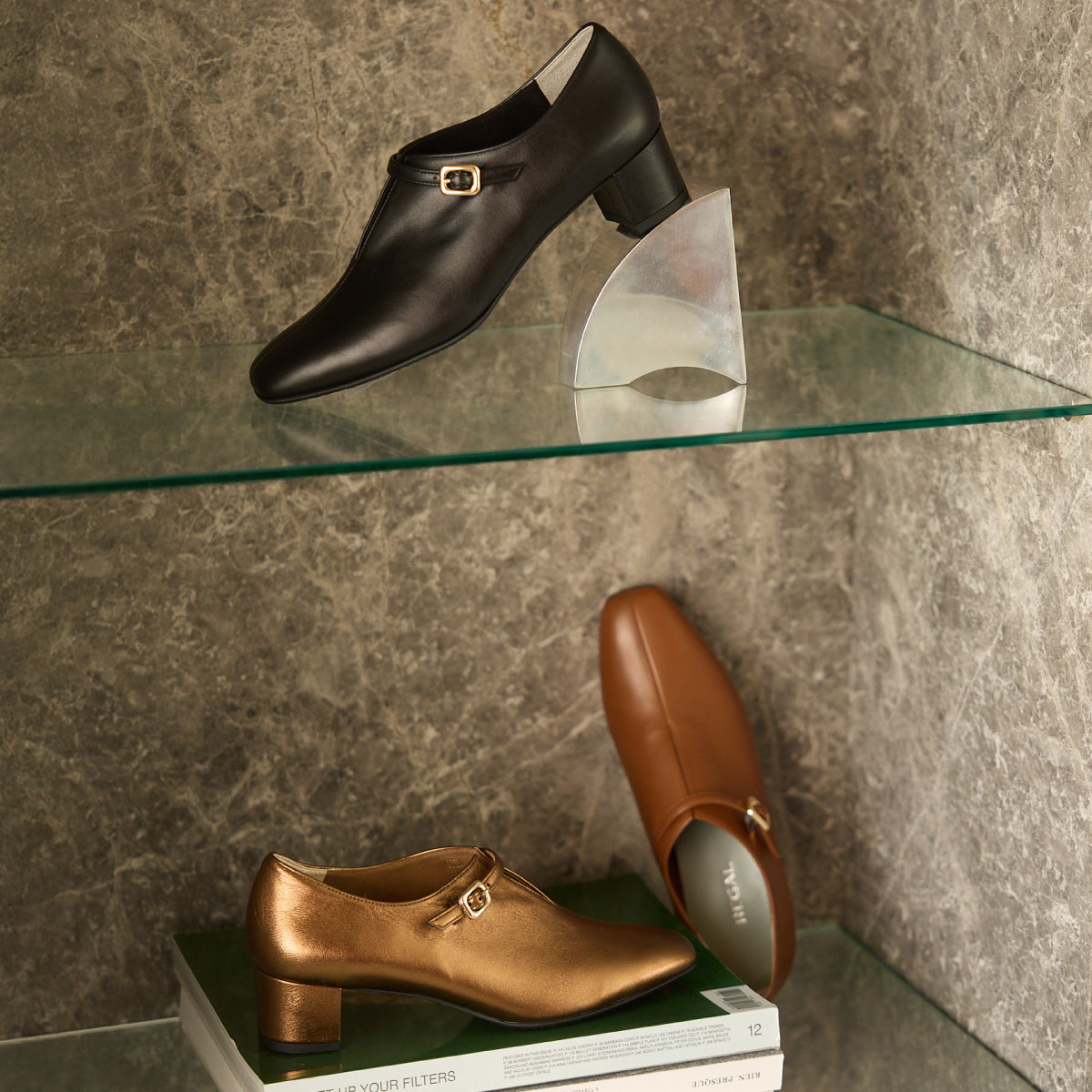 モノトーンにゴールドを合わせるのが好きです。そのスタイルに合わせて選んだパンプスは、ヒールの内側にあしらわれたさりげないゴールドがポイント。見た感じより革が柔らかく、ブロックヒールも高さを感じない安定感があって楽に履けます。