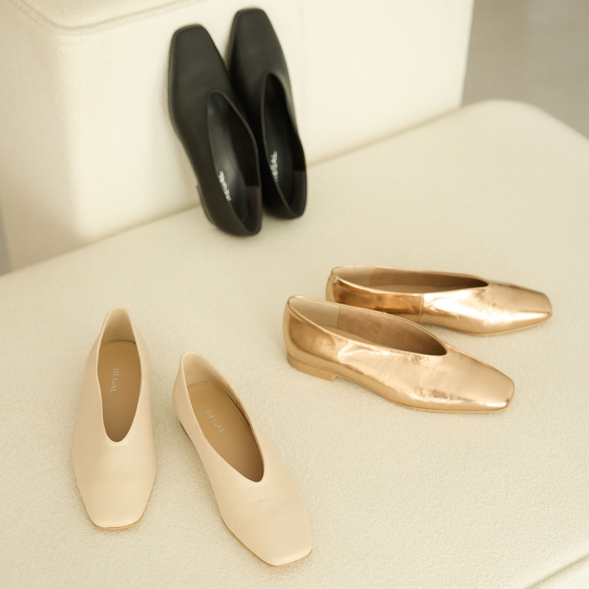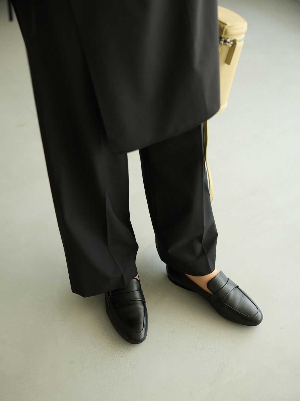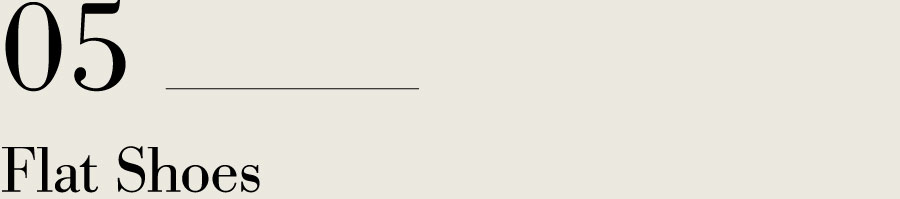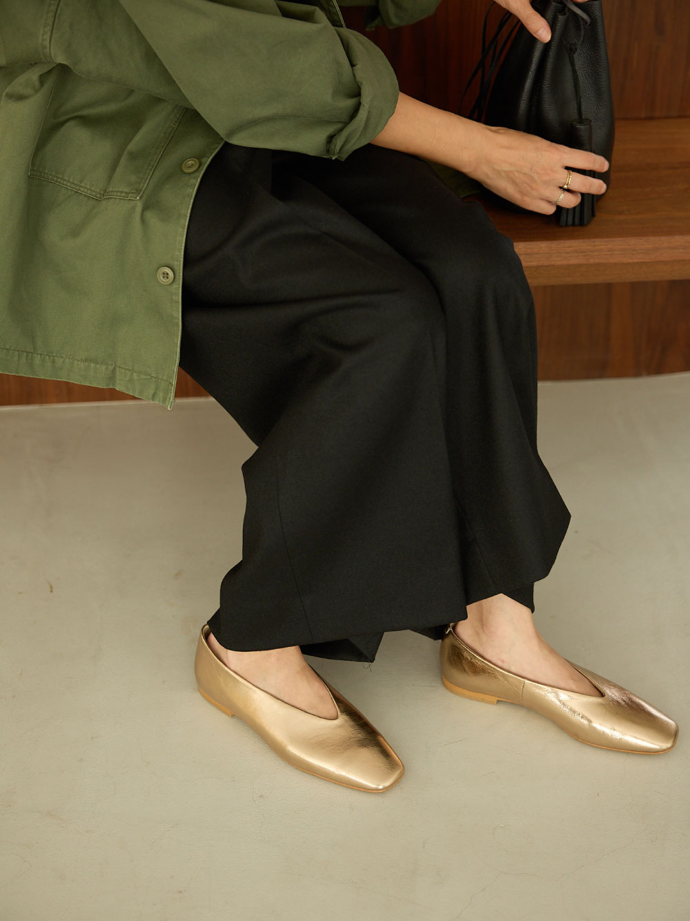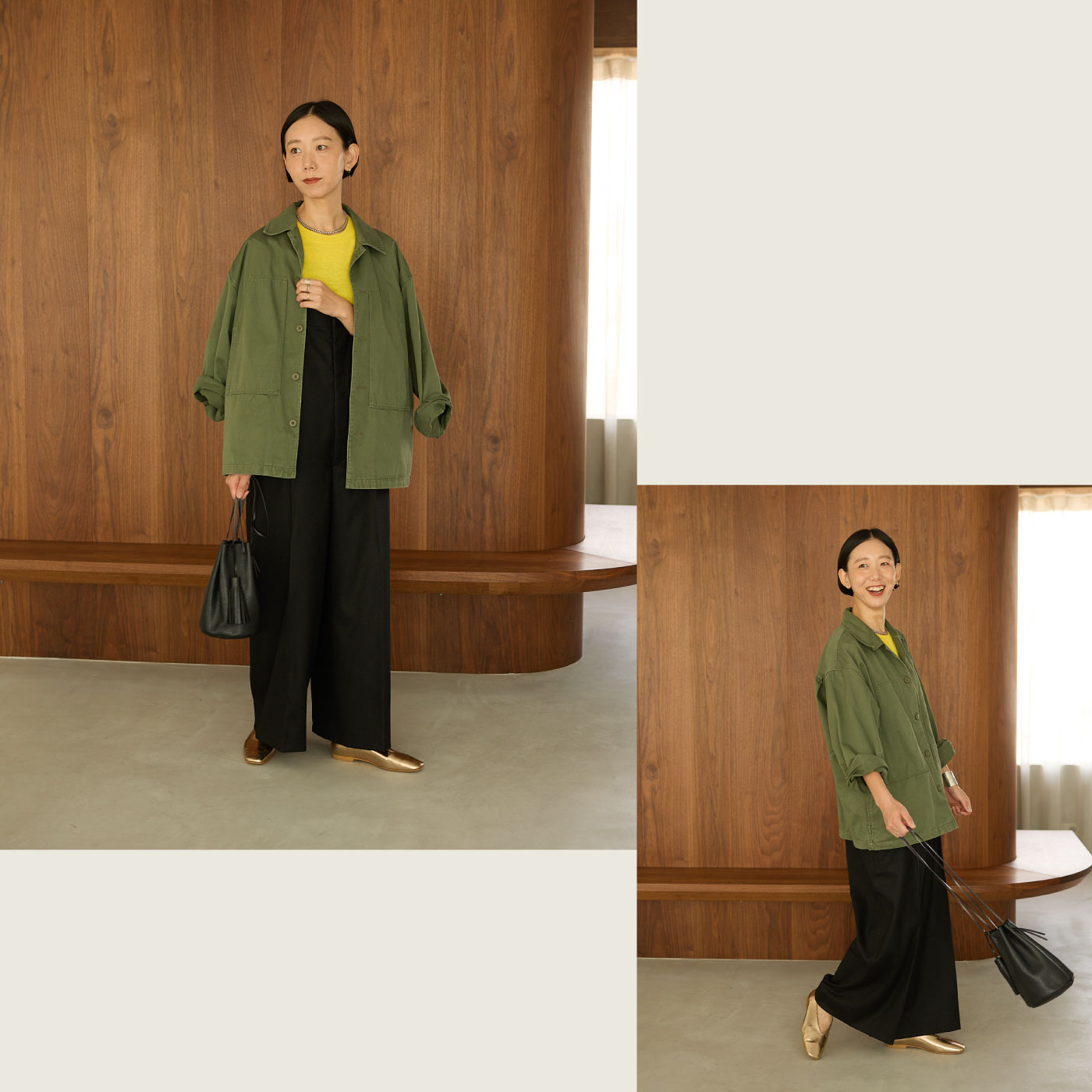 シャープなカッティングデザインのフラットシューズ。革が柔らかく足に馴染みやすいのが魅力で、キラッとしたゴールドも気に入っています。靴を主役に、季節の変わり目を意識して脱ぎ着しやすいジャケットを取り入れました。