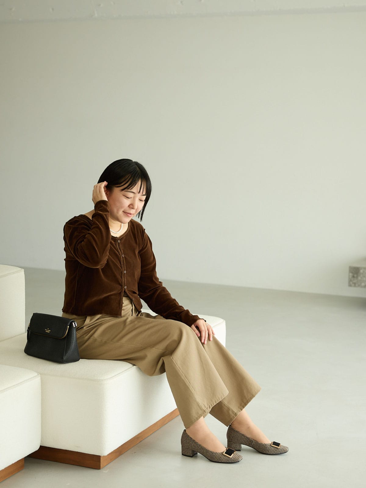 取り入れるだけで一気に秋めいた雰囲気になるツイード調のパンプス。ほどよい高さのヒールでスタイルアップでき、歩きやすさもあります。靴のブラウンやベージュに合わせて、季節感ある素材の洋服を同系色でコーディネートしました。