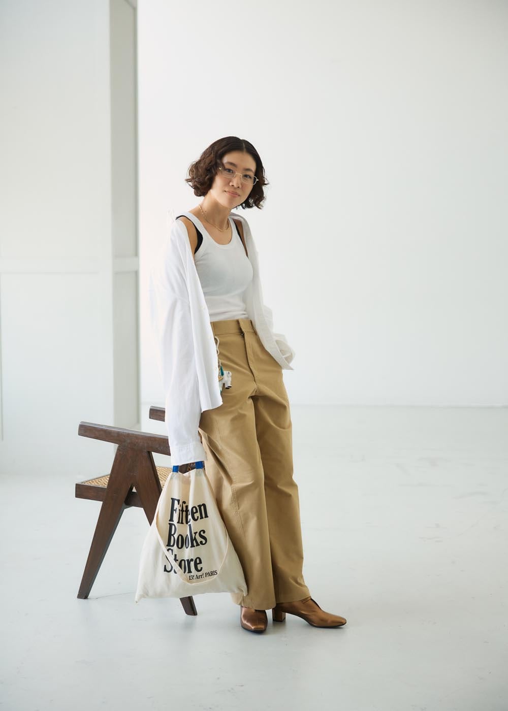 スタイリング全体に言えることですが、私は特に洋服(とくにボトムス)とシューズの色のつながりを意識しています。今回の4つのスタイリングに限らず、日々のコーディネートでも常に心がけているポイントです。