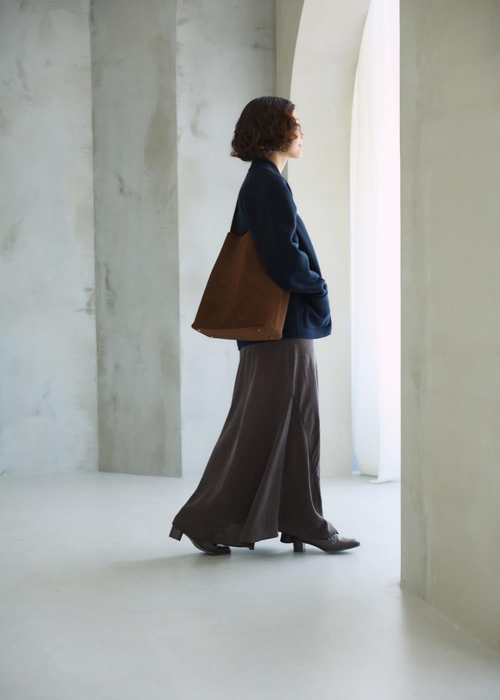 スカートのダークブラウンとの色繋ぎを意識しました。スカートのシルエットや揺れ感を同色のシューズが引き立たせてくれています。ブラウン×ネイビー×グレーといった定番カラーの合わせですが、それぞれの素材感も活かしながら組んだスタイリングです。