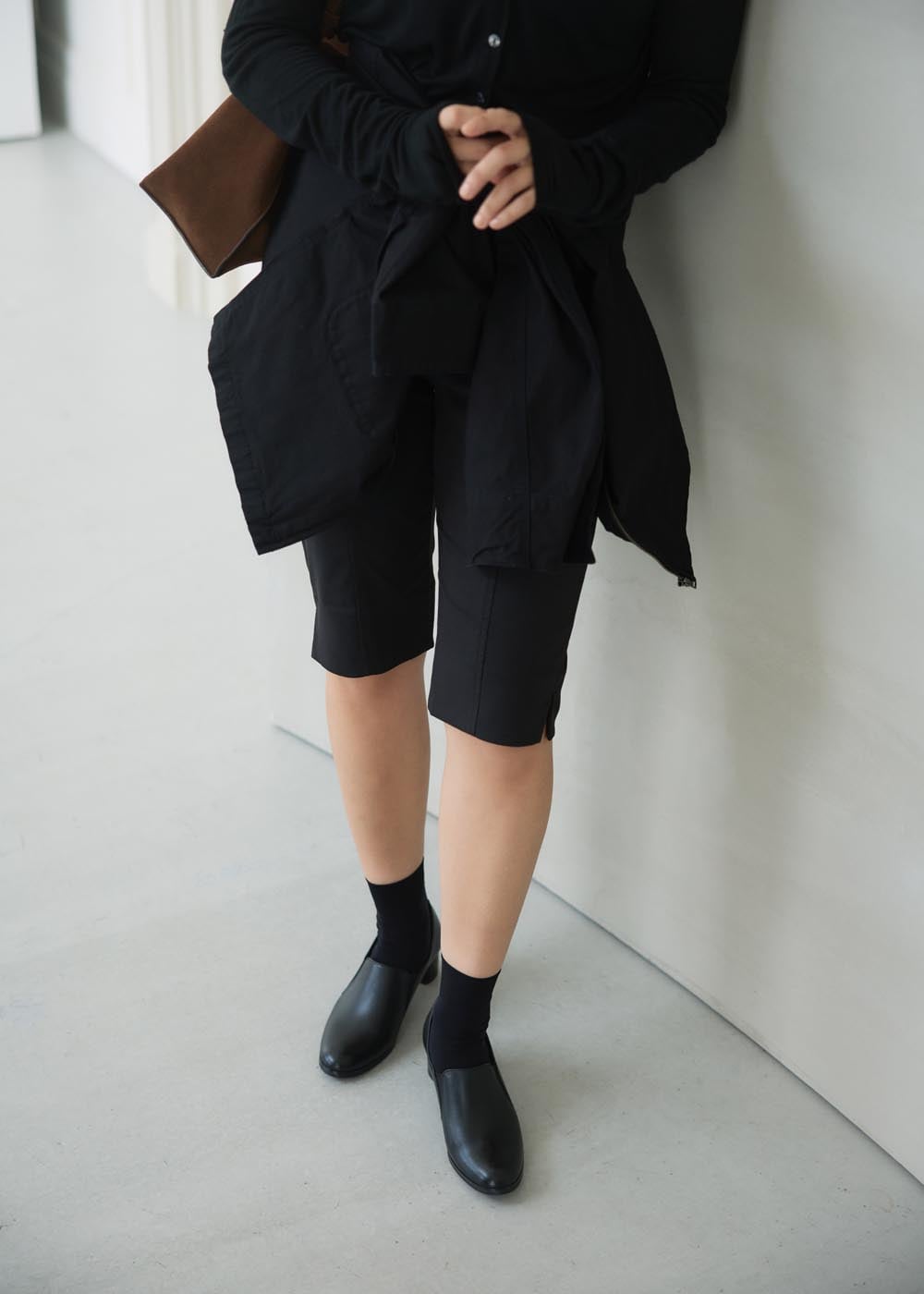 黒のソックスで靴との色をつなげることで、ブーツのようなシルエットに仕上げました。ブーツほど重くならず、パンプスやサンダルよりも季節感を取り入れられる、おすすめの合わせ方です。気温が安定しないこの時季は、さっと羽織れるアイテムを腰に巻いておくことで、利便性とおしゃれ感の両立を意識しています。
