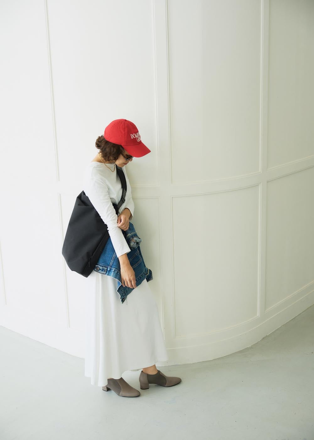 白のワンピースに、すっと馴染む淡いベージュを合わせました。上下をやわらかなトーンでまとめているので、腰にGジャンを巻いたり、黒の大きめバッグや赤いキャップを取り入れて、全体を引き締めています。ぼやけた印象にならないよう、カラーや質感でバランスを取ったスタイリングです。