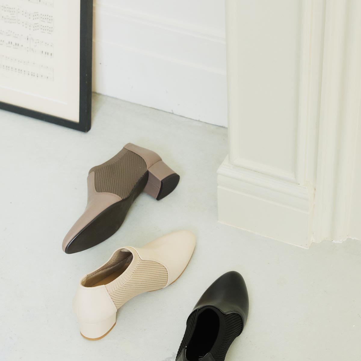 ニット素材の柔らかな印象を、丸みを帯びたアーモンドトウが引き立てる優しい雰囲気のシューティ。デザイン性に加え、ニットならではの伸縮性でさっと脱ぎ履きできるのも嬉しいポイントです。
