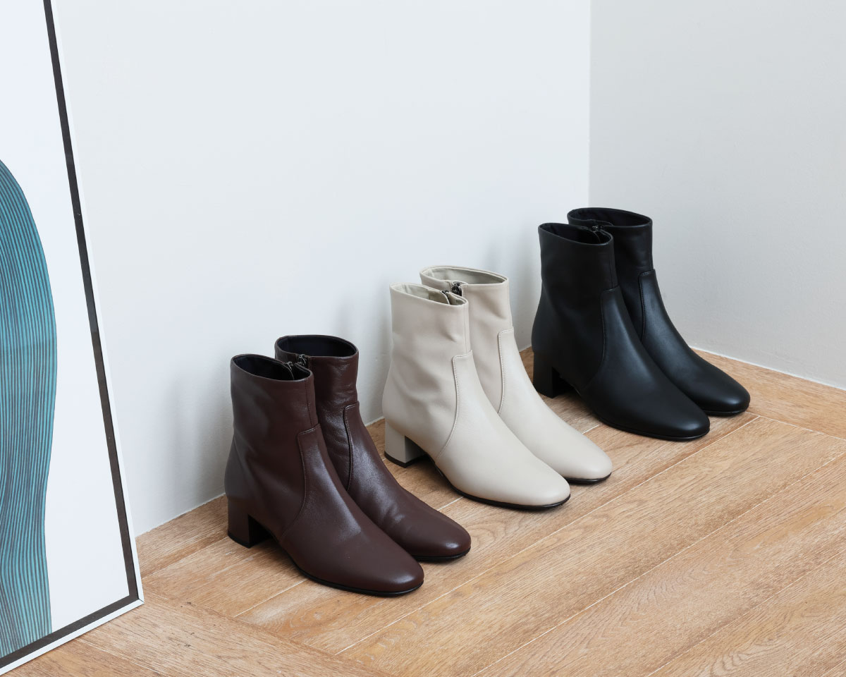 洗練されたシンプルなデザインが幅広いコーディネートで活躍するミドルヒールのブーツ。しっとりと滑らかな手触りのシープレザー、その質感はそのままに、撥水加工を施すことで雨や雪の日でも安心の一足に仕上げました。