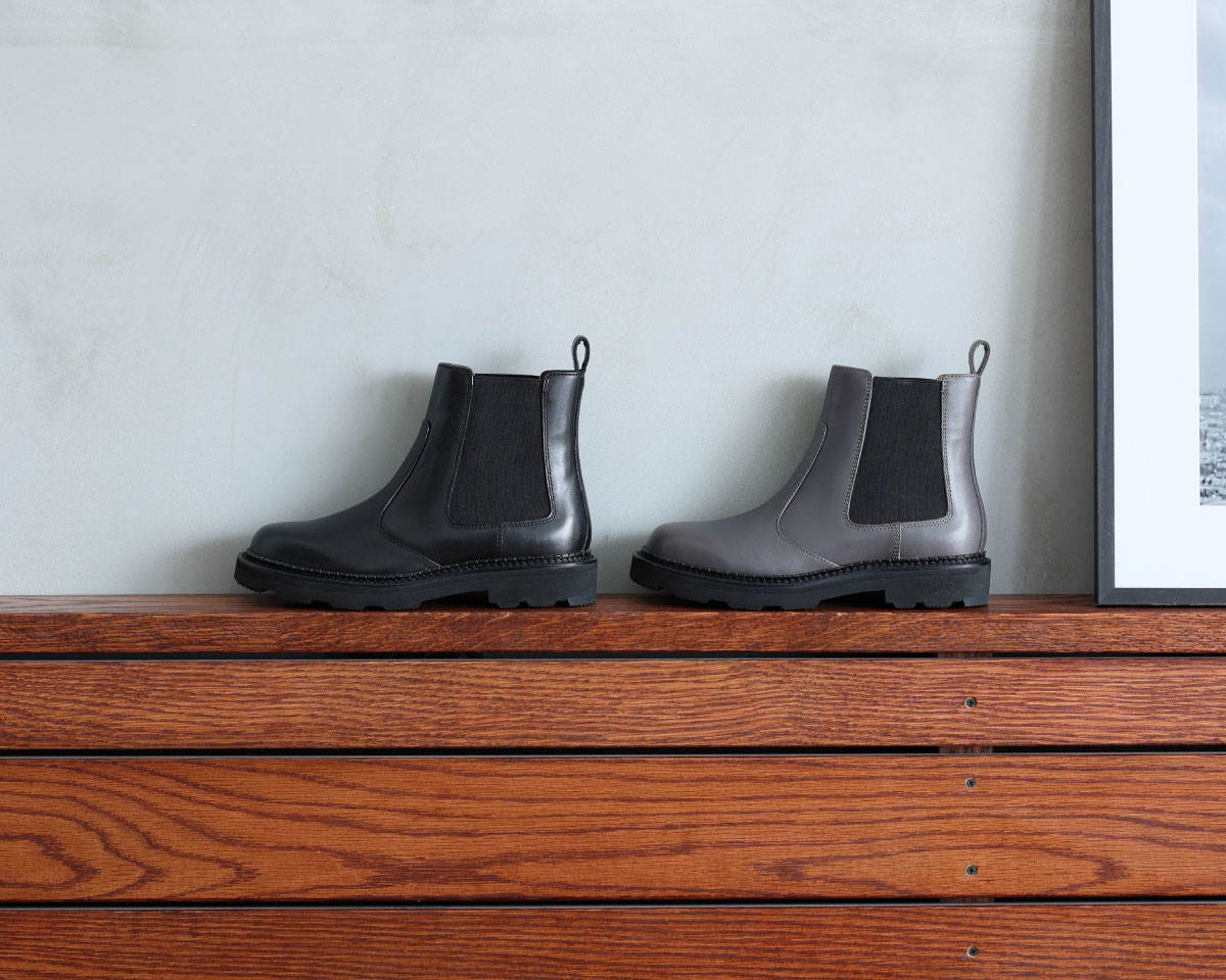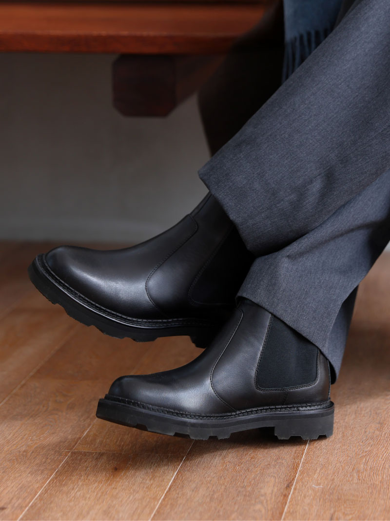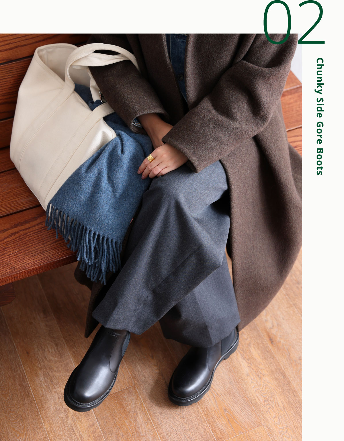 トレンドを超えて、いまや大人のワードローブに欠かせないボリュームソールのサイドゴアブーツ。マニッシュなテイストを取り入れたスタイルも、絶妙なバランスで引き立てます。