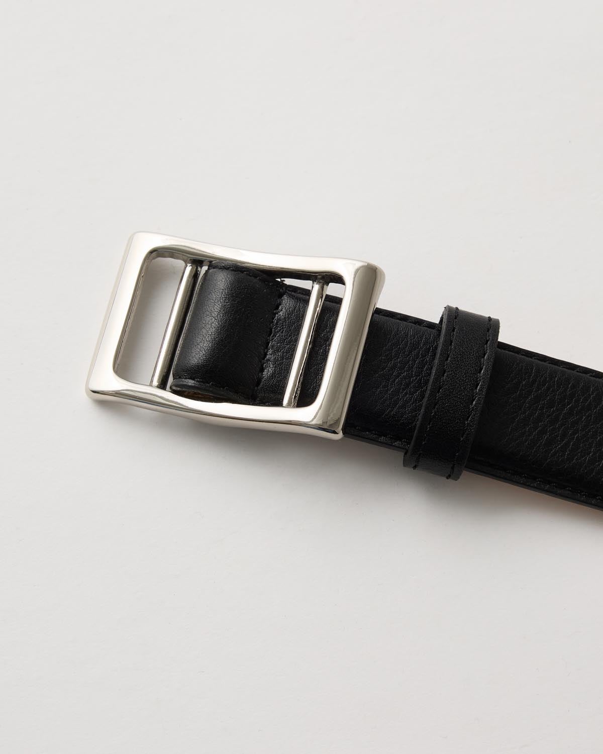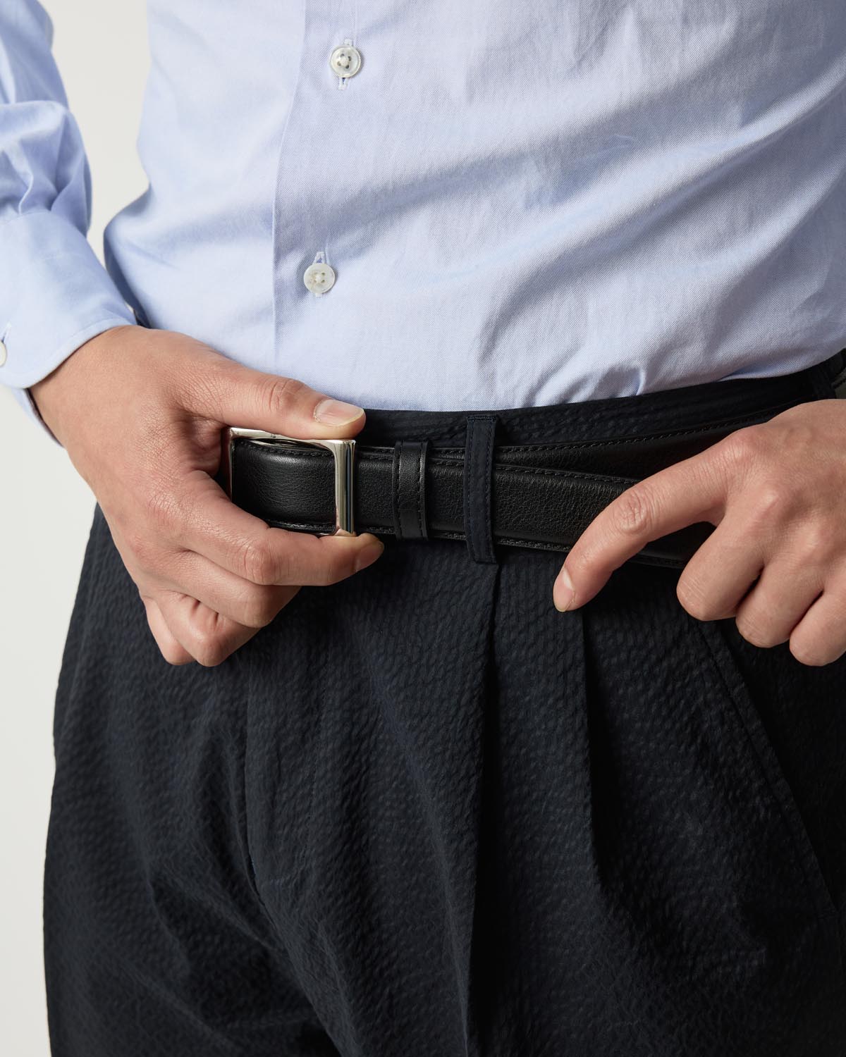 一見すると、シンプルなレザーベルト。実はその裏側にはスマートな「スライドバックル」が隠されています。一般的なベルトのように2〜3cm間隔の位置で合わせるのではなく、ピンホール(ベルト穴)を完全になくしたことで自分にぴったりのサイズにアジャストできます。機能を追求した結果、このミニマルなデザインに辿り着きました。