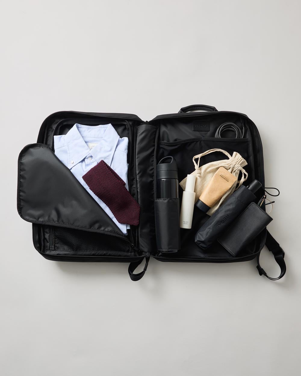 内部には、着替えをスマートに整頓できる「ガーメントオーガナイザー」を内蔵しました。ガジェットや必需品、折りたたみ傘などをそれぞれ決まった場所へ。カフェのテーブルや新幹線の座席でも、バッグを大きく広げずに必要なものをさっと取り出せます。