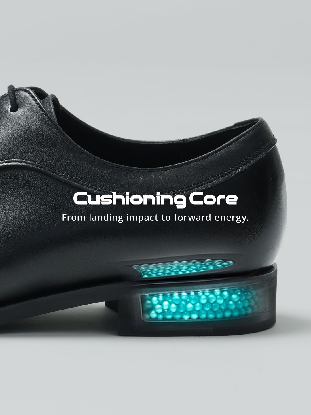 新感覚の歩行体験を生み出すのは、ヒールに内蔵された独自開発のクッション材「Cushioning Core(クッショニングコア)」。着地の衝撃を、次の一歩への力へとスムーズに変換します。
