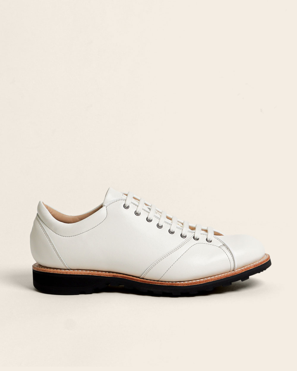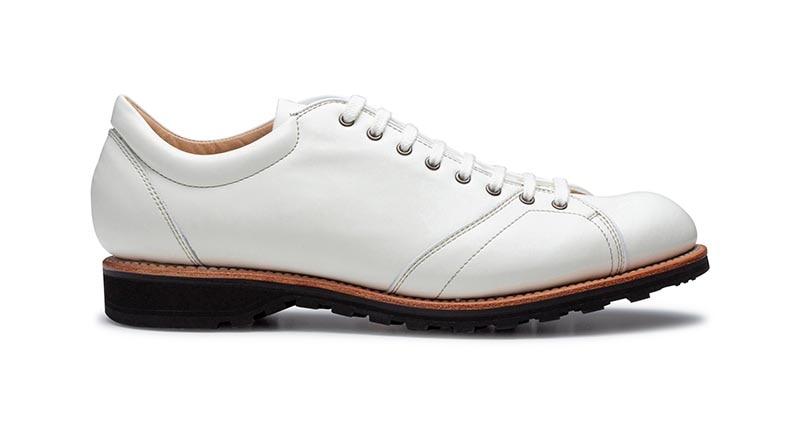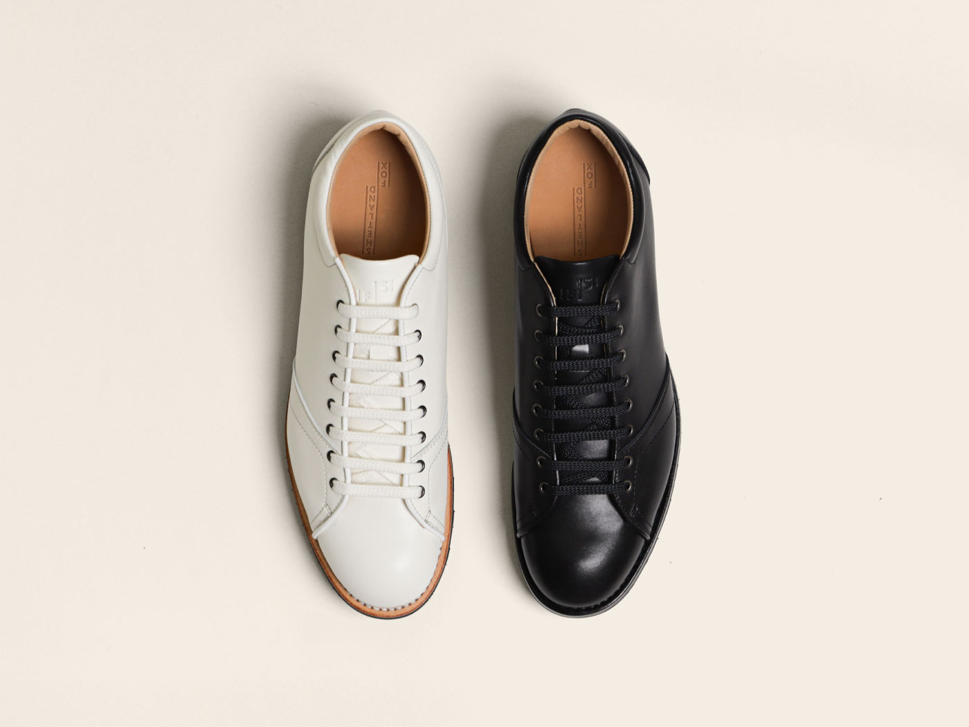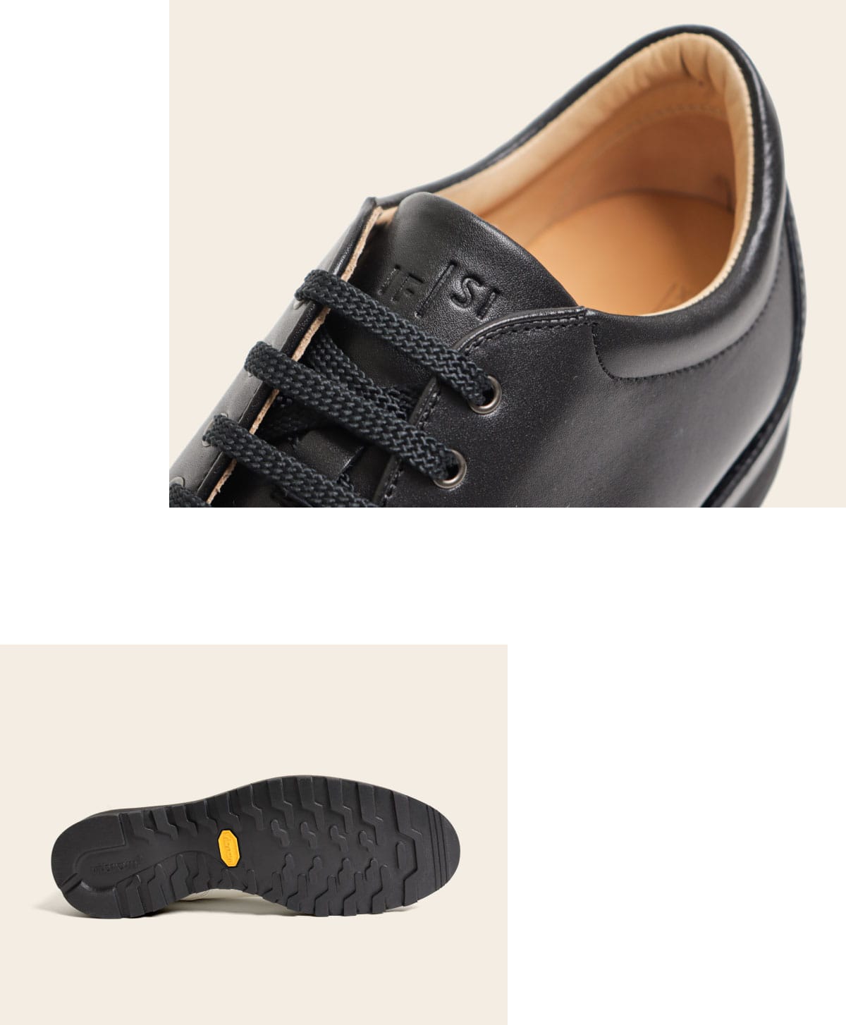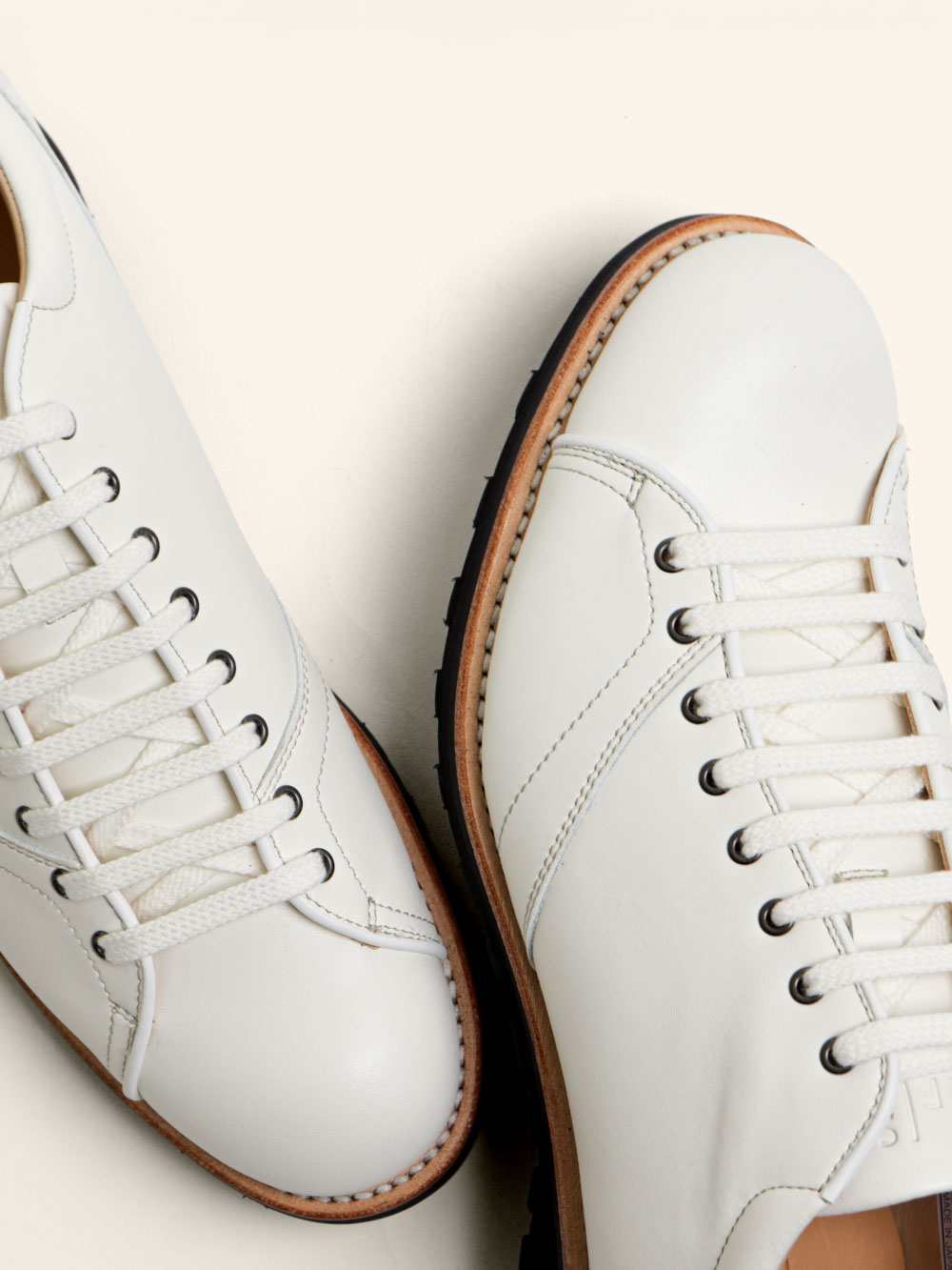 スニーカーとしては類を見ない、ウェストを極めて絞り込んだ木型。加えて靴の踏みつけに該当する部分を一般的な靴より前に設定することで、指先への圧迫を軽減すると同時に、SHETLANDFOXらしい個性的なシルエットを生んでいる。