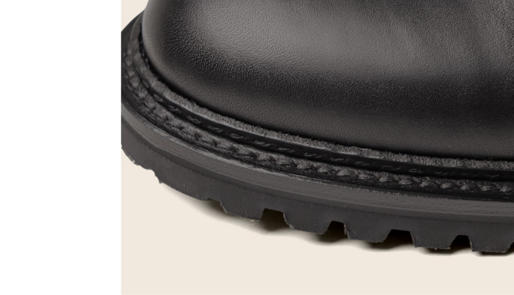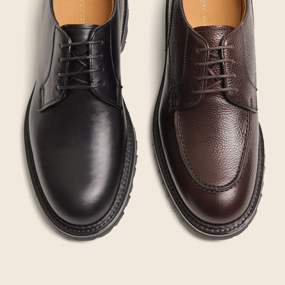 ブラックには、英国・C.F.STEAD社(チャールズ・F・ステッド)のオイルドレザーを採用。しっとりと吸い付くような上質なテクスチャーの中に、確かな無骨さを宿した。 一方、ダークブラウンは仏・Annonay社(アノネイ)の「ラスティーカーフ」をセレクト。大粒の型押しが放つ重厚な存在感とは裏腹に、驚くほど柔らかな足当たりが特徴だ。