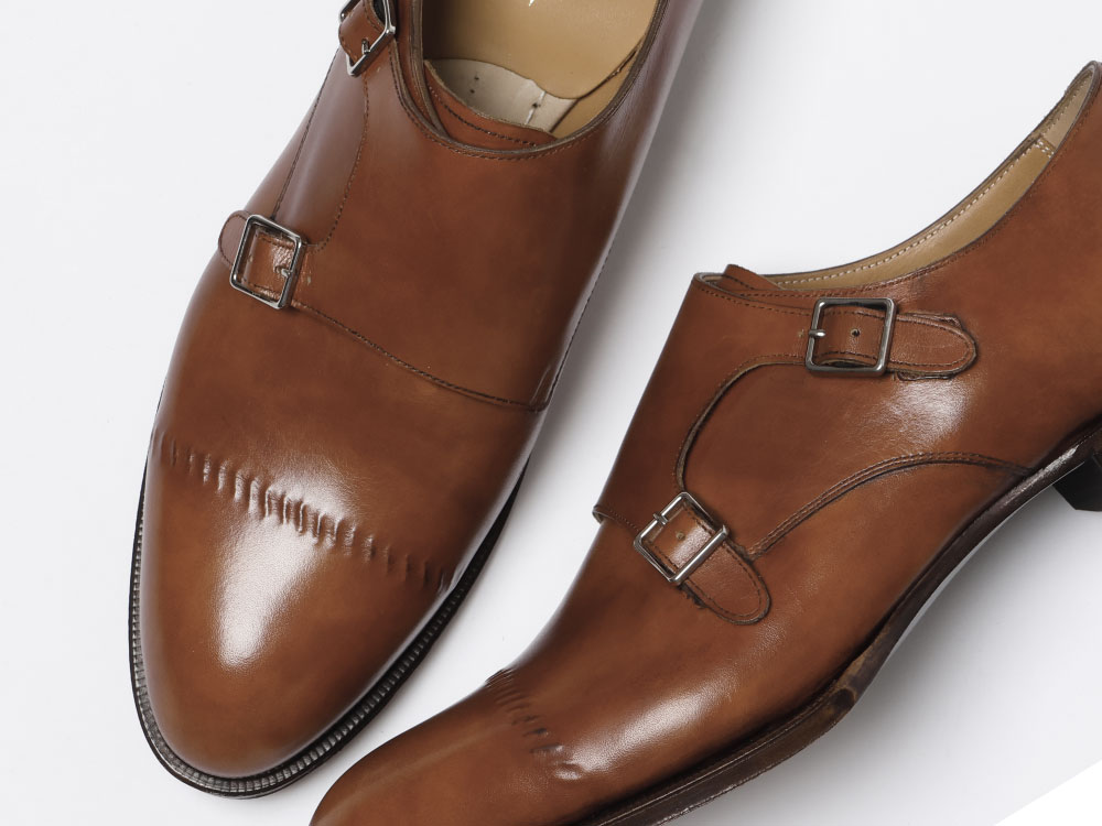 ダブルモンクのキャップ部には「シャドーステッチ」を施した。スキンステッチの技術の一つで、わずか1.5mm程の革の厚みに、貫通しないよう糸を通してステッチ痕を付けていく、まさに職人技だ。またローファーのモカ部分にもスキンステッチを採用。表面に浮き上がった糸の盛り上がりが表面に響くことでひだのように見え、モカ縫いを表現している。