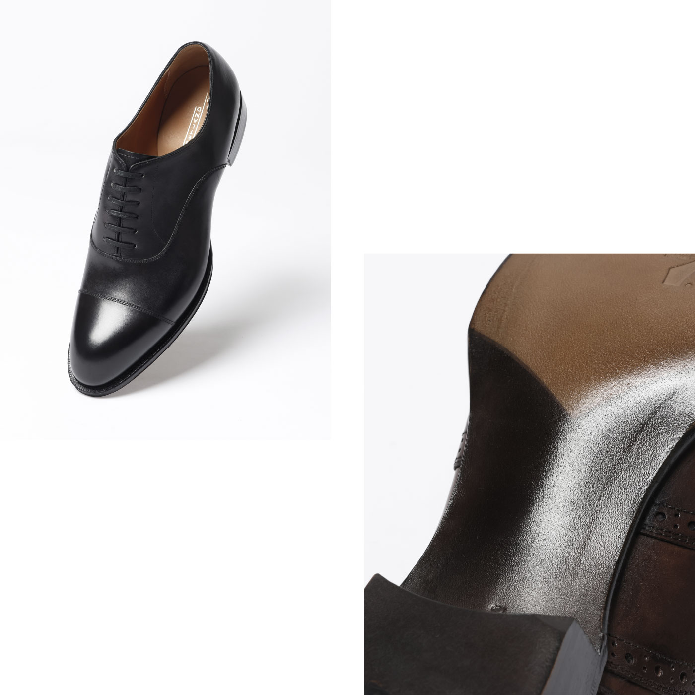 底面に目を向けると、見えない部分にもこだわりが詰まっている。半カラスのラインと相まった、フィドルバックの美しい輪郭。ヒールは接地面にかけて細くシェイプするピッチドヒールを採用し、多様なビスポークシューズの意匠を既製のレディメイドシューズに落とし込んだ。